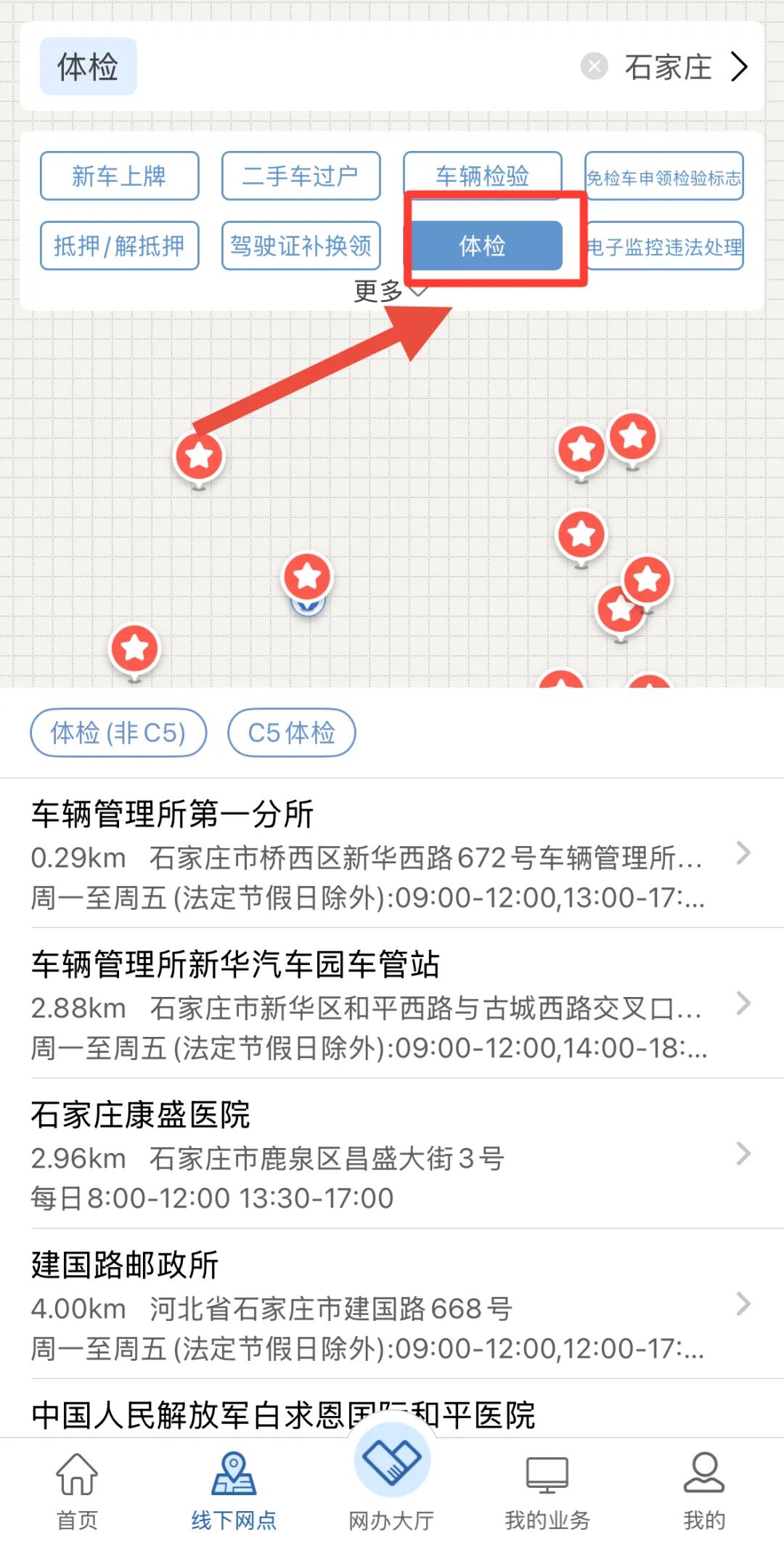 打开“交管12123”App,在“线下网点”的搜索栏中搜索“体检”,就可以找到最近可以办理驾驶人体检的点位。线下体检后,其体检记录将被直接同步给交管部门。
