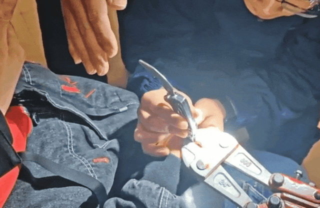 男孩手指卡在“蝴蝶刀”的环扣中。图源:南通消防