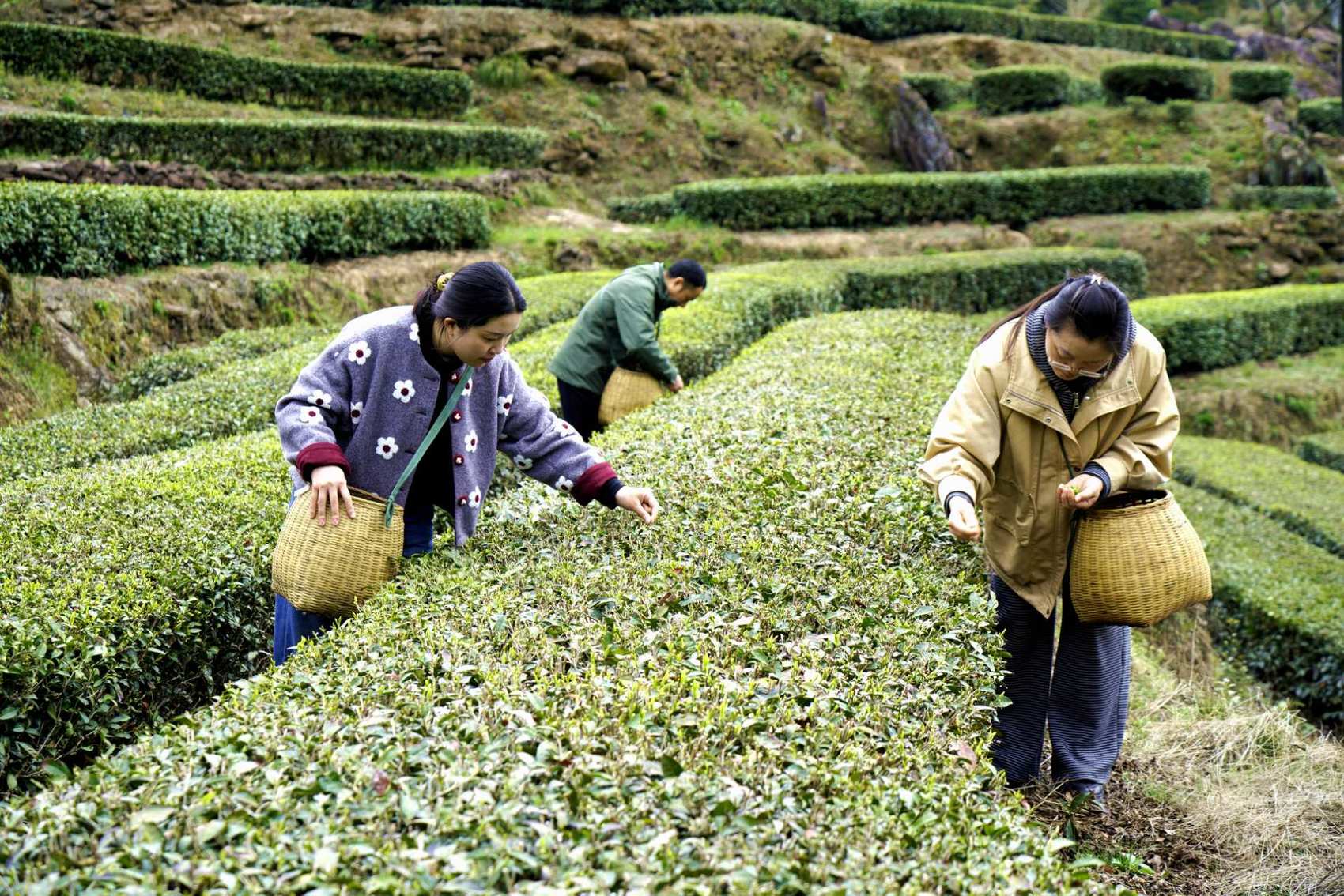 通江县烟溪镇钟凤村茶农们挎着竹篮,穿行于茶垄之间,娴熟地采摘着今年的第一茬嫩芽。