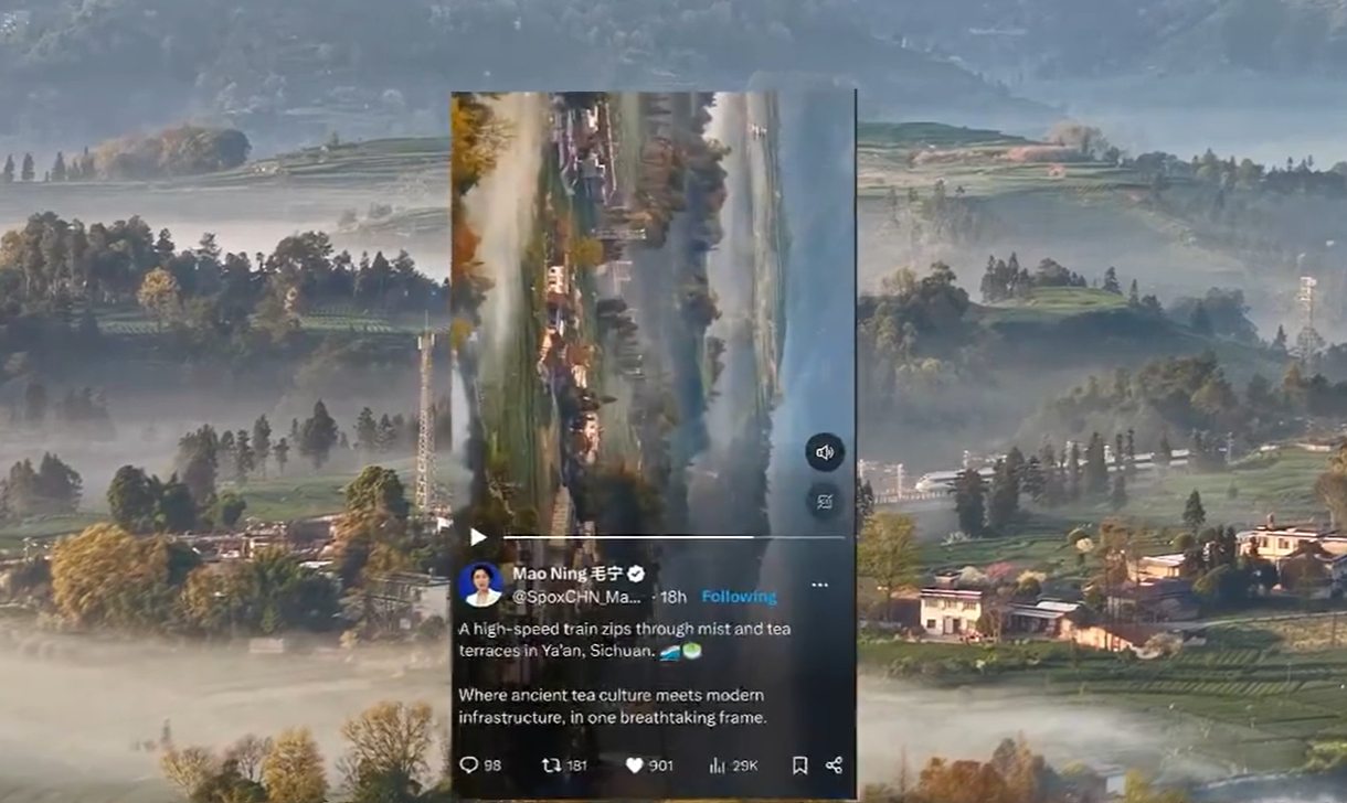 本周,外交部发言人毛宁转发了一条名为“当高铁驶入‘千里江山图’”的短视频,并向海内外网友推介:“Where ancient tea culture meets modern infrastructure, in one breathtaking frame.(当古老的茶文化与现代基础设施相遇,定格于令人惊叹的一帧之中)。”