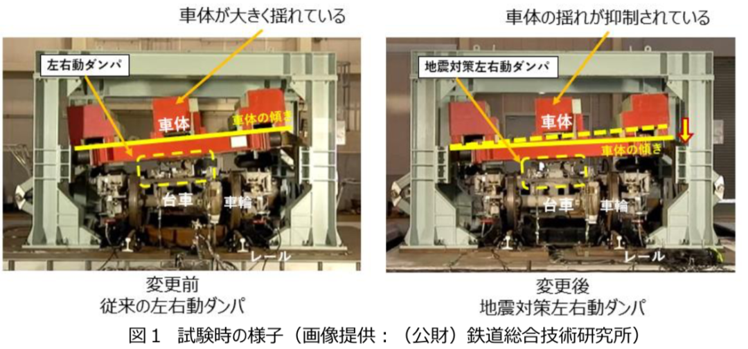 该装置通过在地震动向车体传递的过程中降低振动,抑制车体左右摇晃,从而降低脱轨或逸脱风险。地震横向减震阻尼器针对地震时的大振动也能发挥减震效果,相比传统型减震阻尼器采用了能够吸收更大力的减震结构。