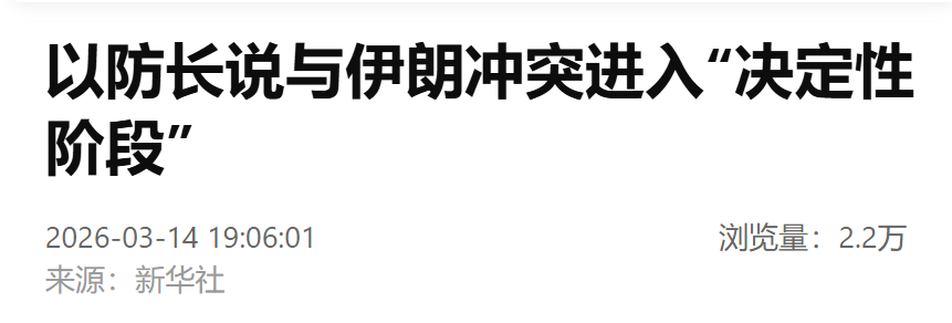 据新华社,以色列国防部长卡茨14日说,以色列与伊朗的冲突“正在升级”且进入“决定性阶段”,将持续到“必要之时”。