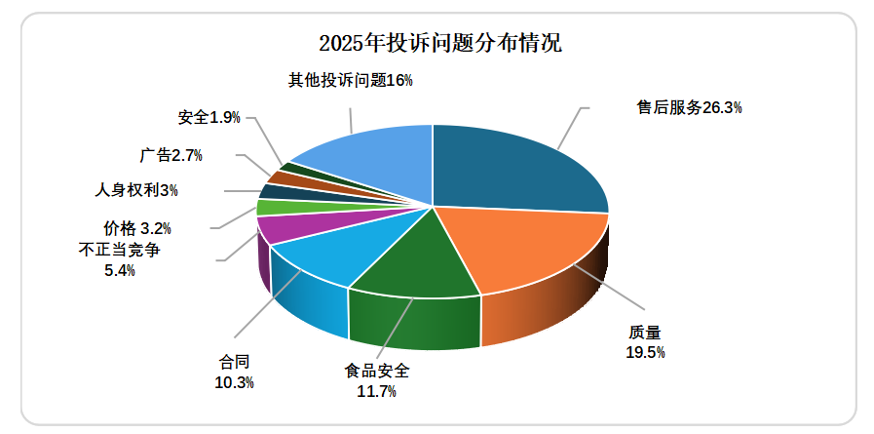 2025年,全国市场监管部门共受理投诉2036.6万件,同比增长9.3%,投诉总量首次突破2000万件,消费者维权意识持续增强。从投诉问题来看,售后服务、质量问题、食品安全问题、合同问题等相对突出,分别占投诉总量的26.3%、19.5%、11.7%、10.3%,其中售后服务投诉量已连续三年排在问题首位。