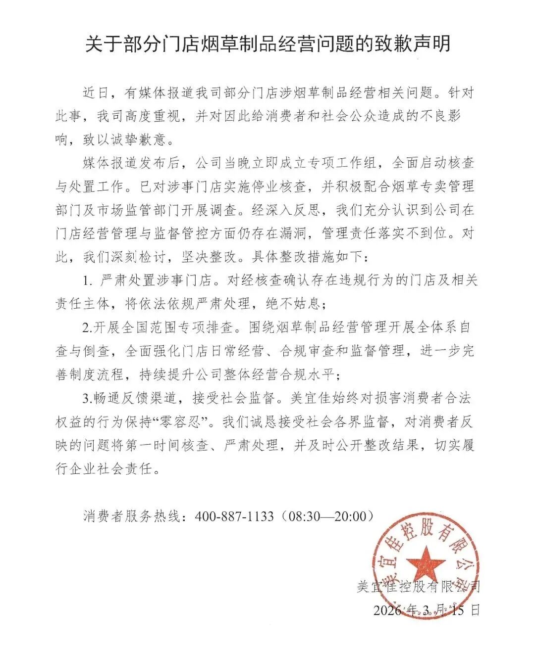 近日,有媒体报道我司部分门店涉烟草制品经营相关问题。针对此事,我司高度重视,并对因此给消费者和社会公众造成的不良影响,致以诚挚歉意。媒体报道发布后,公司当晚立即成立专项工作组,全面启动核查与处置工作。已对涉事门店实施停业核查,并积极配合烟草专卖管理部门及市场监管部门开展调查。经深入反思,我们充分认识到公司在门店经营管理与监督管控方面仍存在漏洞,管理责任落实不到位。对此,我们深刻检讨,坚决整改。具体整改措施如下: