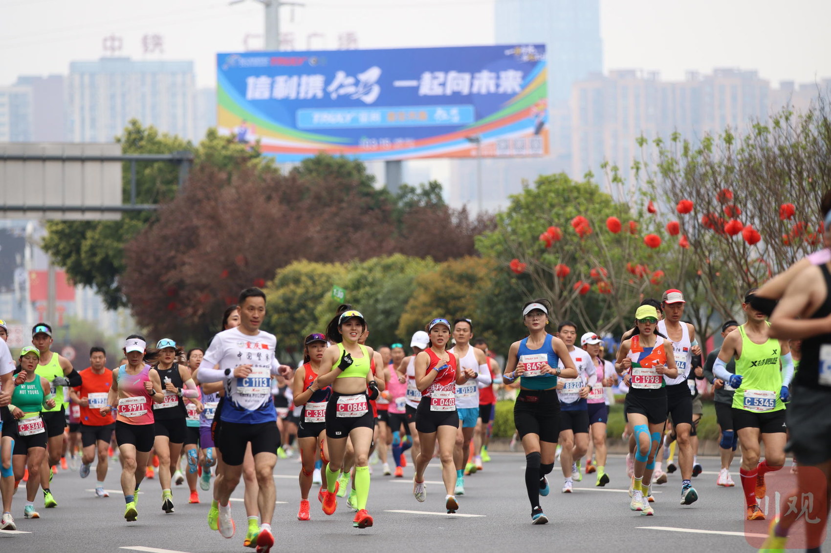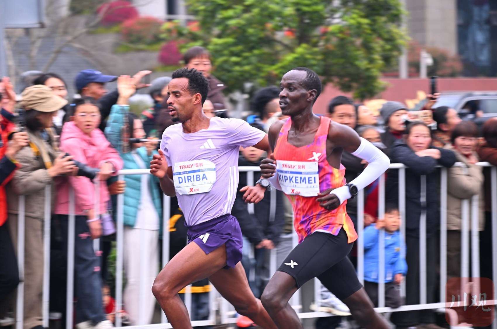 参赛选手在赛道上奋力奔跑,现场氛围热烈昂扬。