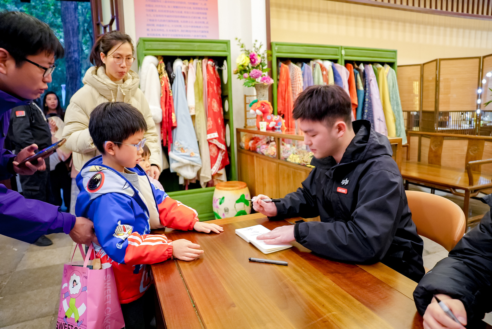 冠军李轩豪给学棋少年签名