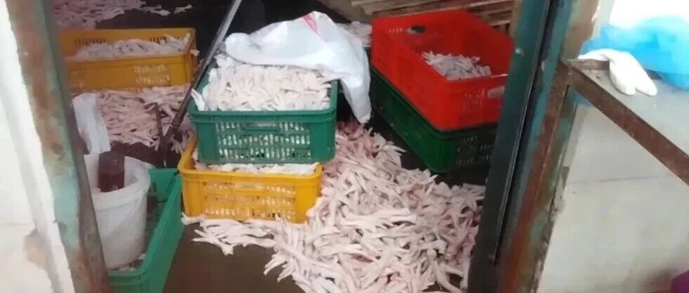 记者在鸡爪销售火爆的川渝地区展开调查,在未办理健康证、未做任何健康体检、未经过任何卫生消毒的情况下,记者很轻松地进入成都市明扬食品生产车间,这里正是为蜀福香食品有限责任公司鸡爪产品进行前期加工的场所。在现场,记者看到食品加工车间里,泡制区、修剪区、挑选区臭气弥漫,刺鼻的腥臭味让人作呕,生产环境脏乱不堪:地面长期淤积着浑浊污水,各类塑料筐杂乱无章随意堆放,生产机械设备表面污渍厚重、油污遍布。在这个车间里,大量鸡爪直接裸露堆放在潮湿肮脏的地面上,扫帚、铁锹等清洁工具随意压放在鸡爪之上;即便鸡爪被人员踩踏,工人也只是随手捡起,直接放回加工筐中继续使用,完全无视食品卫生安全。