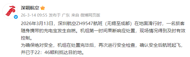 3月14日,深圳航空官方微博通报,2026年3月13日,深圳航空ZH9547航班(无锡至成都)在地面滑行时,一名旅客随身携带的充电宝发生自燃。机组第一时间果断响应处置,现场情况得到及时有效控制。