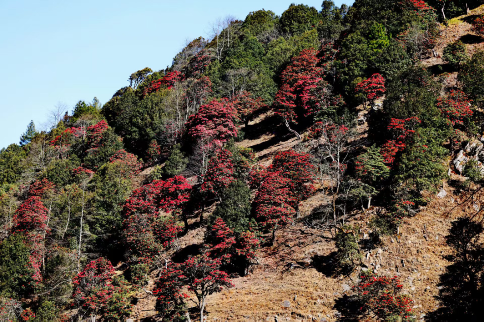 眼下,怒江傈僳族自治州六兰公路分水岭碧峰山的半山腰,古杜鹃已悄然绽放,将广袤山野晕染成一片醉人的红霞,把春日的浪漫与生机,悄悄藏进了怒江的崇山峻岭间。