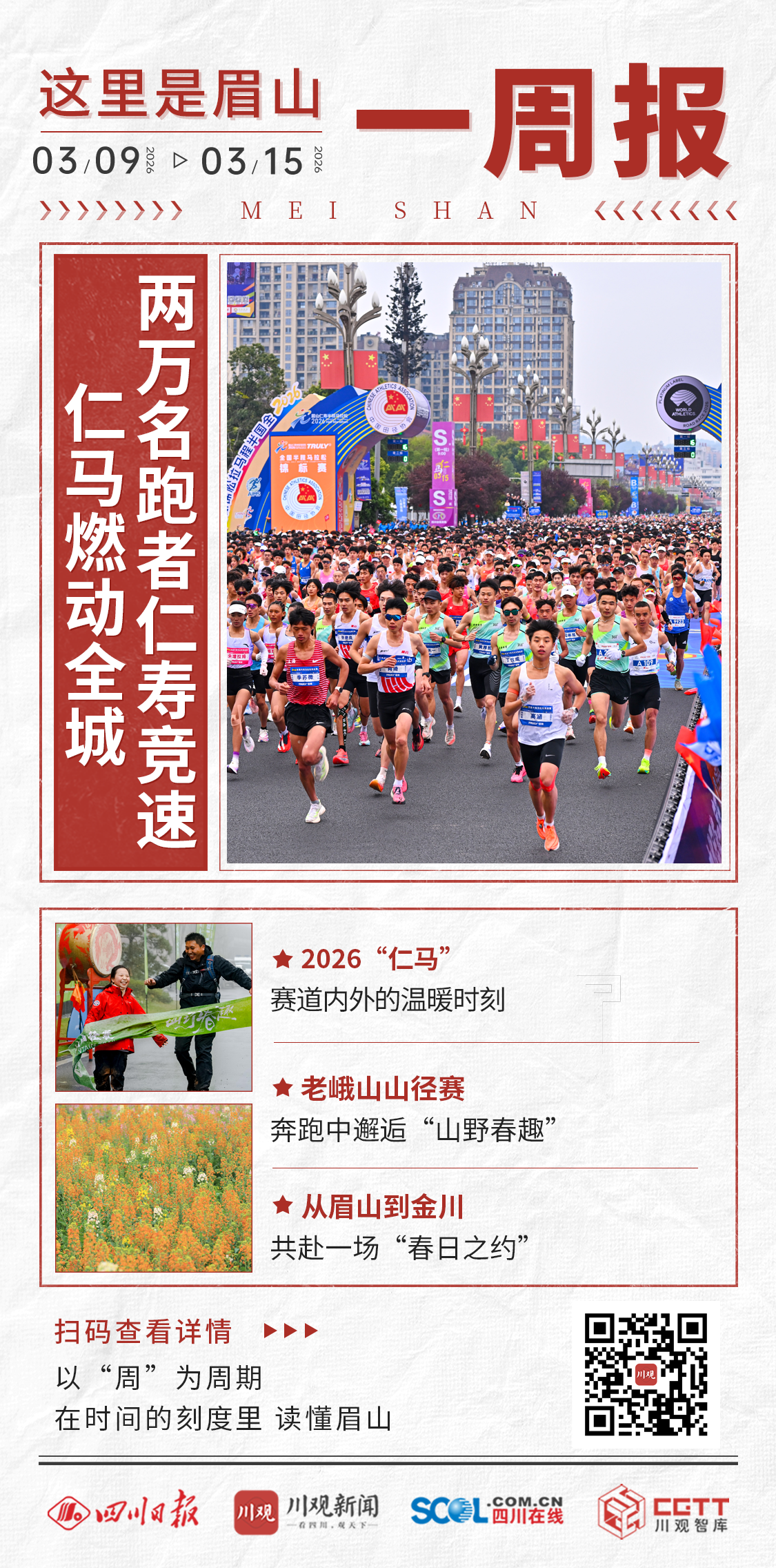 3月9日-15日,这一周,眉山的“速度”与“颜值”同在。2万名跑者在仁寿“最美赛道”上追逐极限,260名山径赛选手在丹棱老峨山的茶香梨花间寻觅野趣。与此同时,从仁寿曹家的万亩“雪海”到阿坝金川的漫山梨花,一份份“春日请柬”正发往各地。这一周,眉山用奔跑的姿态,打开了一整个春天。