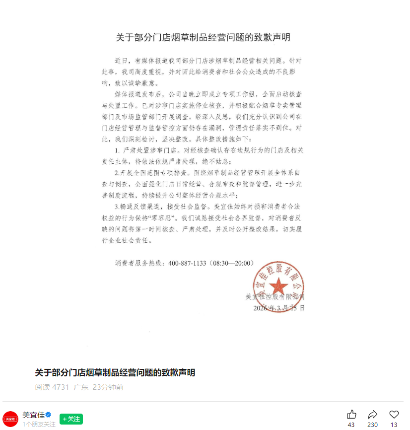 今天(3月15日)下午,美宜佳官方账号发布关于部分门店烟草制品经营问题的致歉声明:
