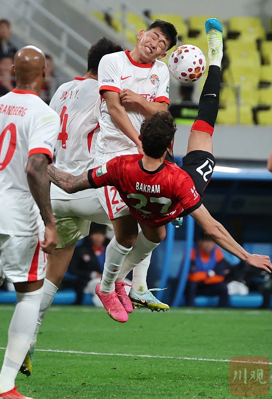 成都蓉城队员拜合拉木(红衣)奋起倒勾。
