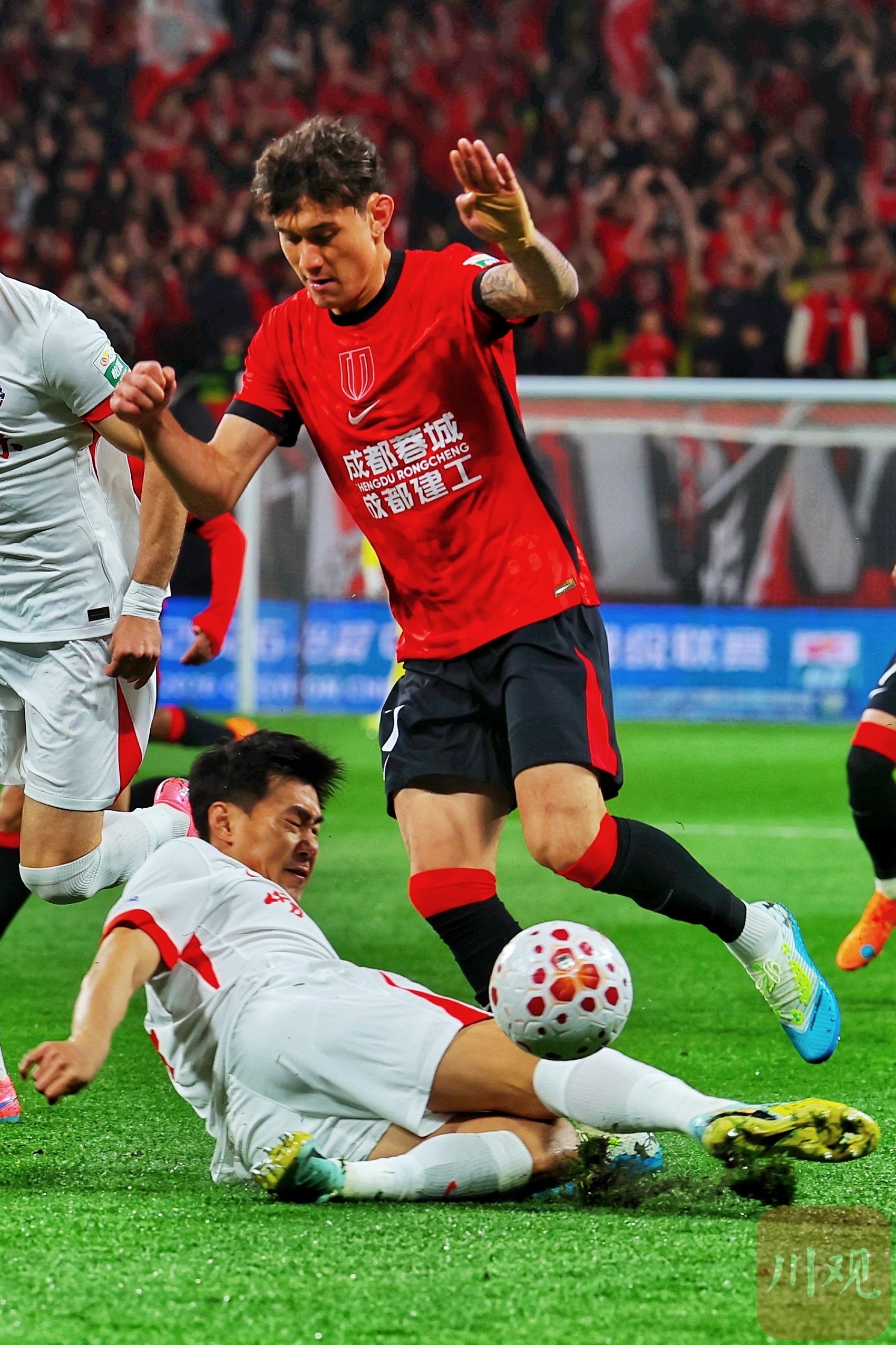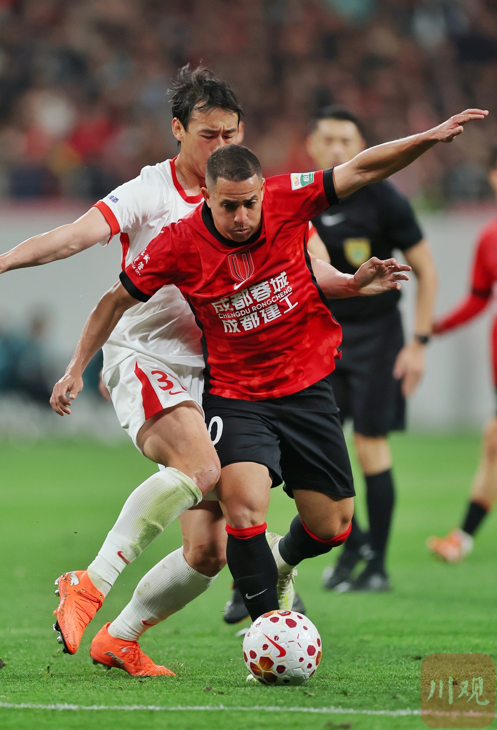 成都蓉城队员罗慕洛(红衣)带球突破。