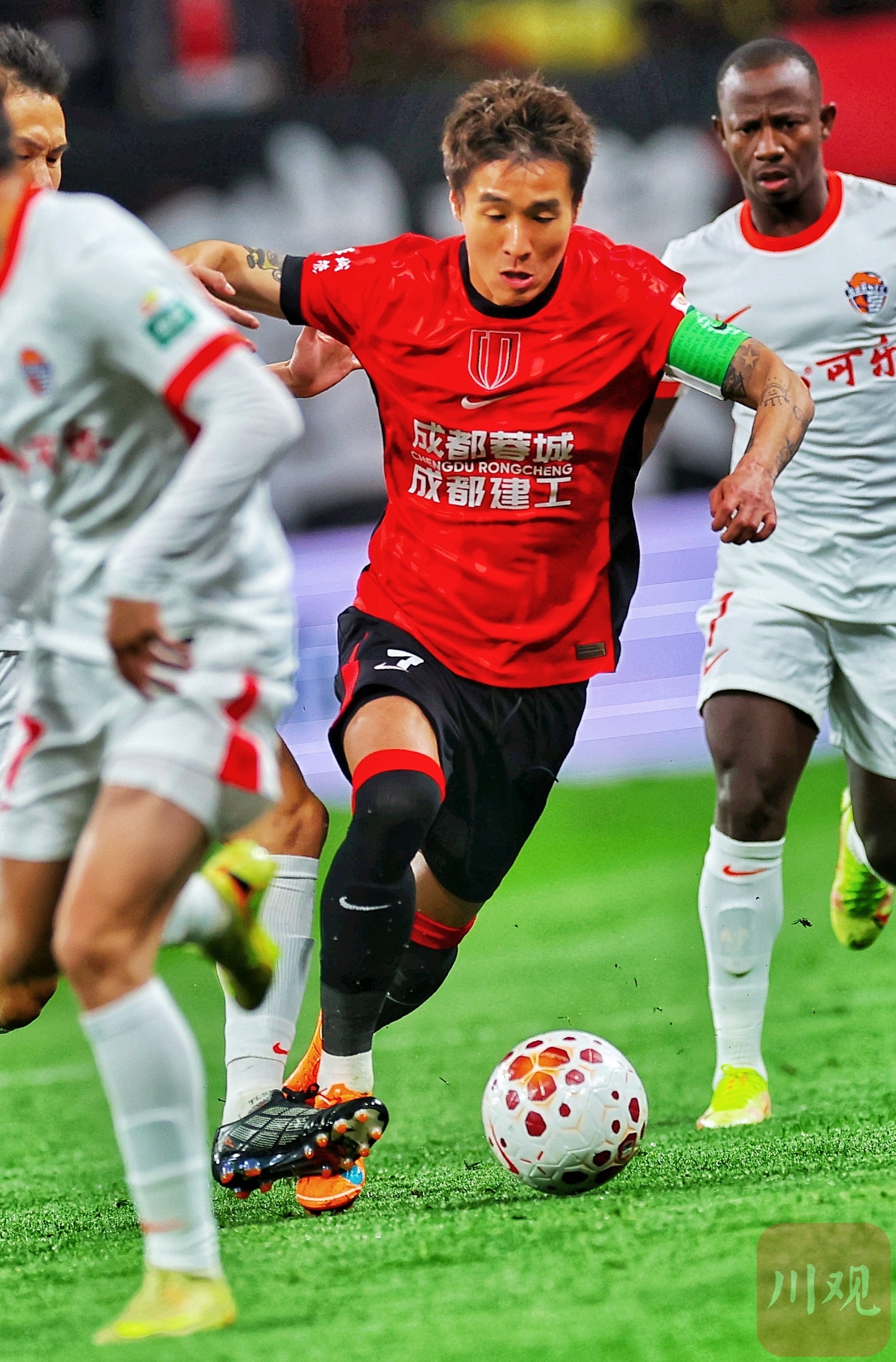 成都蓉城队长韦世豪(红衣)带球突破。