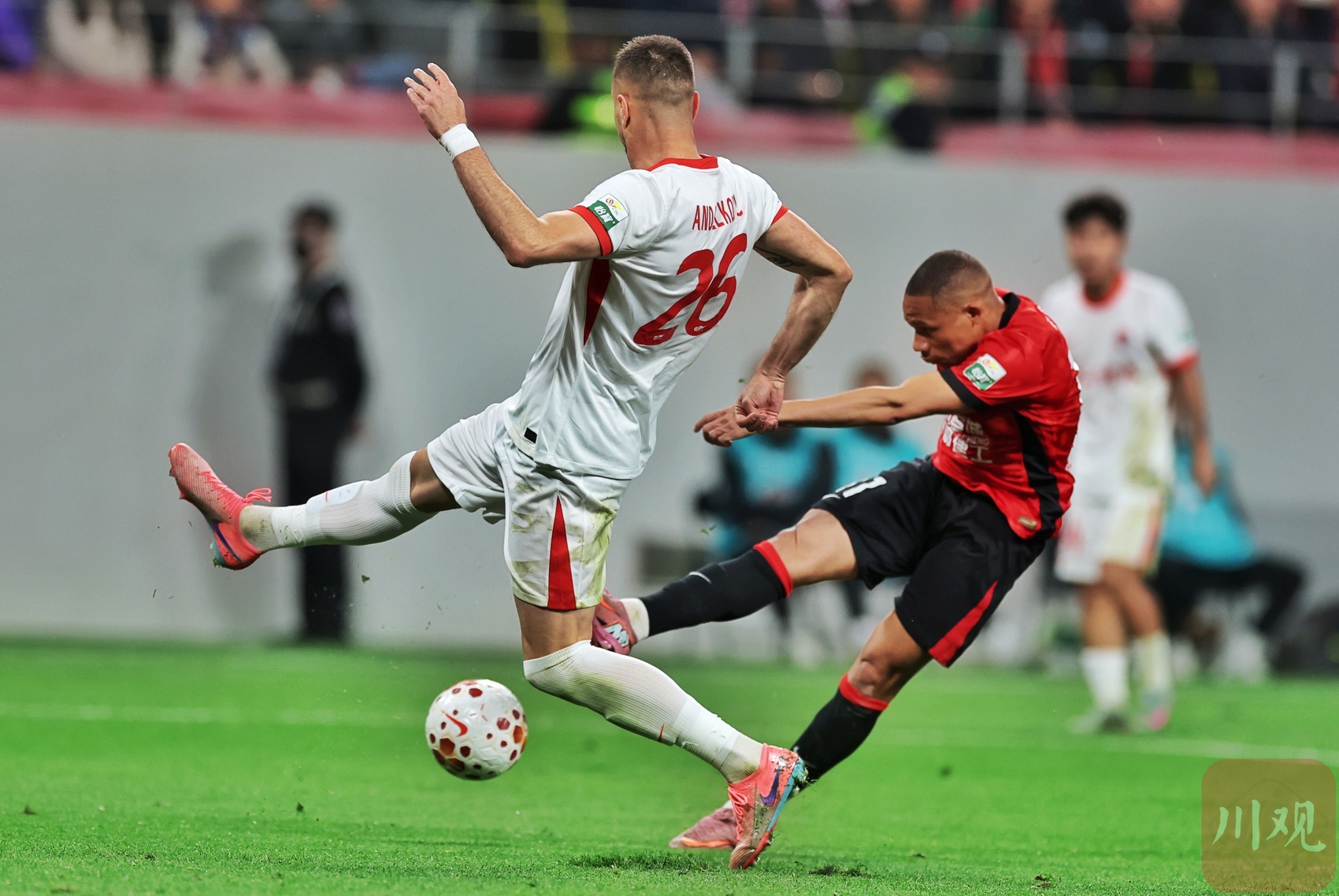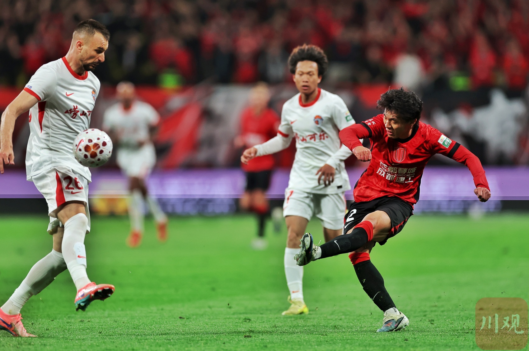 成都蓉城队员席尔瓦(红衣)攻门。