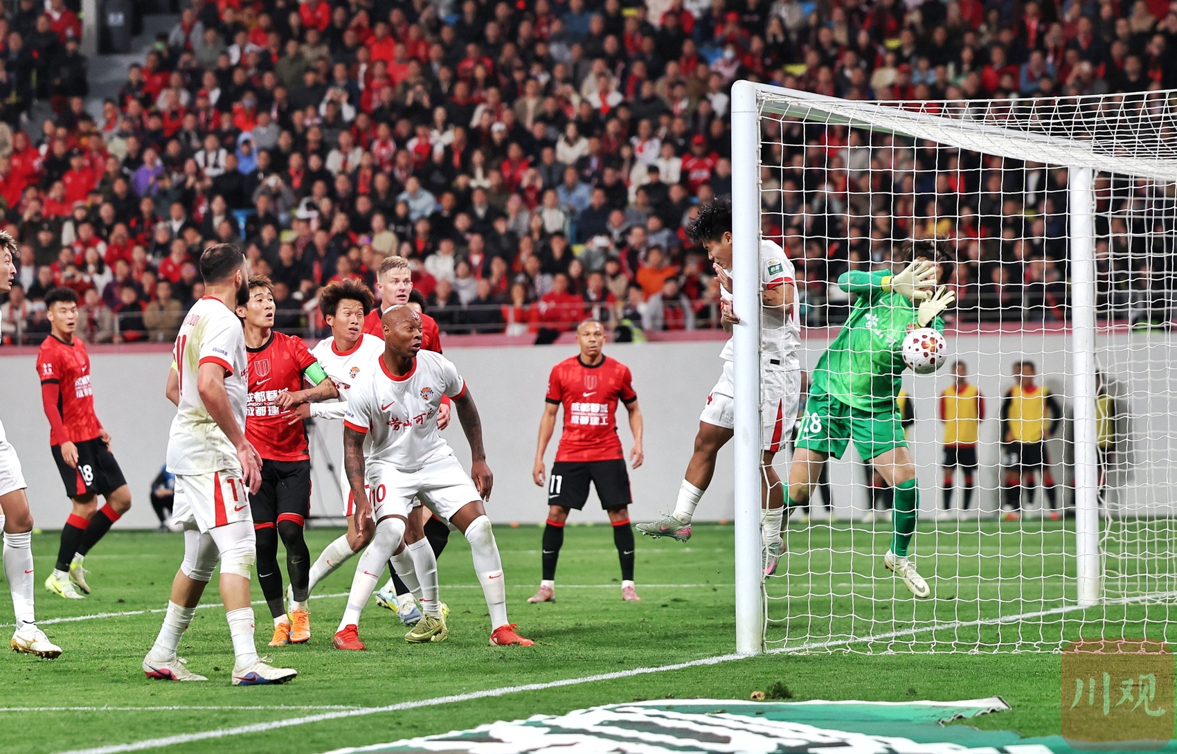 成都蓉城队员罗慕洛踢出的角球破门瞬间。