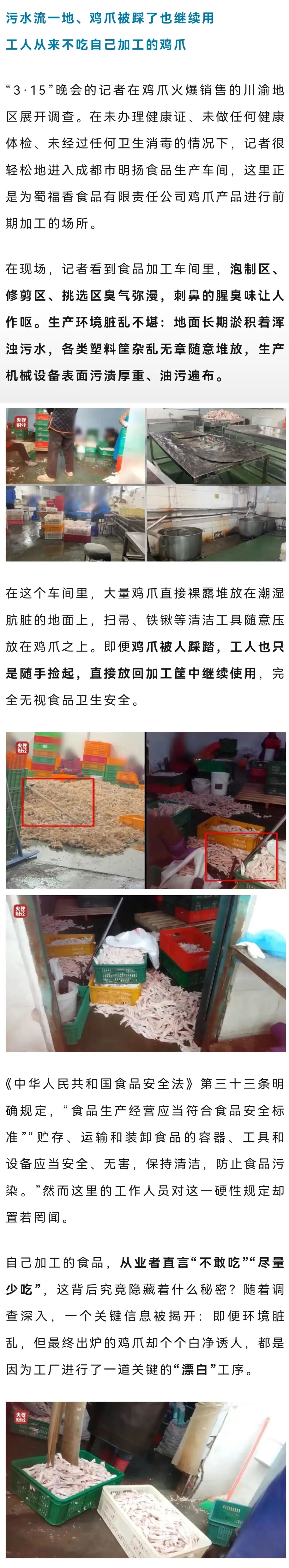 这些鸡爪凭借鲜辣爽口的独特风味,成为老少皆宜,尤其深受年轻人与孩子们追捧的热门零食,在川渝地区,网红鸡爪更是家喻户晓、备受青睐。市场上售卖的各种鸡爪,大多色泽白净、肉质饱满,让人看着就有食欲,但有一个细节,引发了记者的高度关注,就是鸡爪食品的价格。一份500克的鸡爪,很多时候售价低至15元,超低的售价、庞大的销量,并不符合正常食品生产成本的规律。网红鸡爪食品的背后,真的如这些鸡爪外表一般干净放心吗?