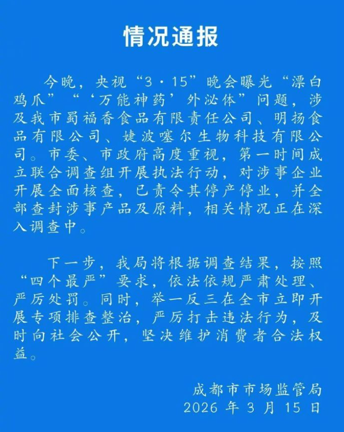 今晚,央视“315”晚会曝光“漂白鸡爪”“‘万能神药’外泌体”问题,及我市蜀福香食品有限责任公司、明扬食品有限公司、婕波噻尔生物科技有限公司。市委、市政府高度重视,第一时间成立联合调查组开展执法行动,对涉事企业开展全面核查,已责令其停产停业,并全部查封涉事产品及原料,相关情况正在深入调查中。