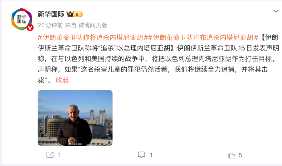 据@新华国际 消息,伊朗伊斯兰革命卫队称将“追杀”以总理内塔尼亚胡。