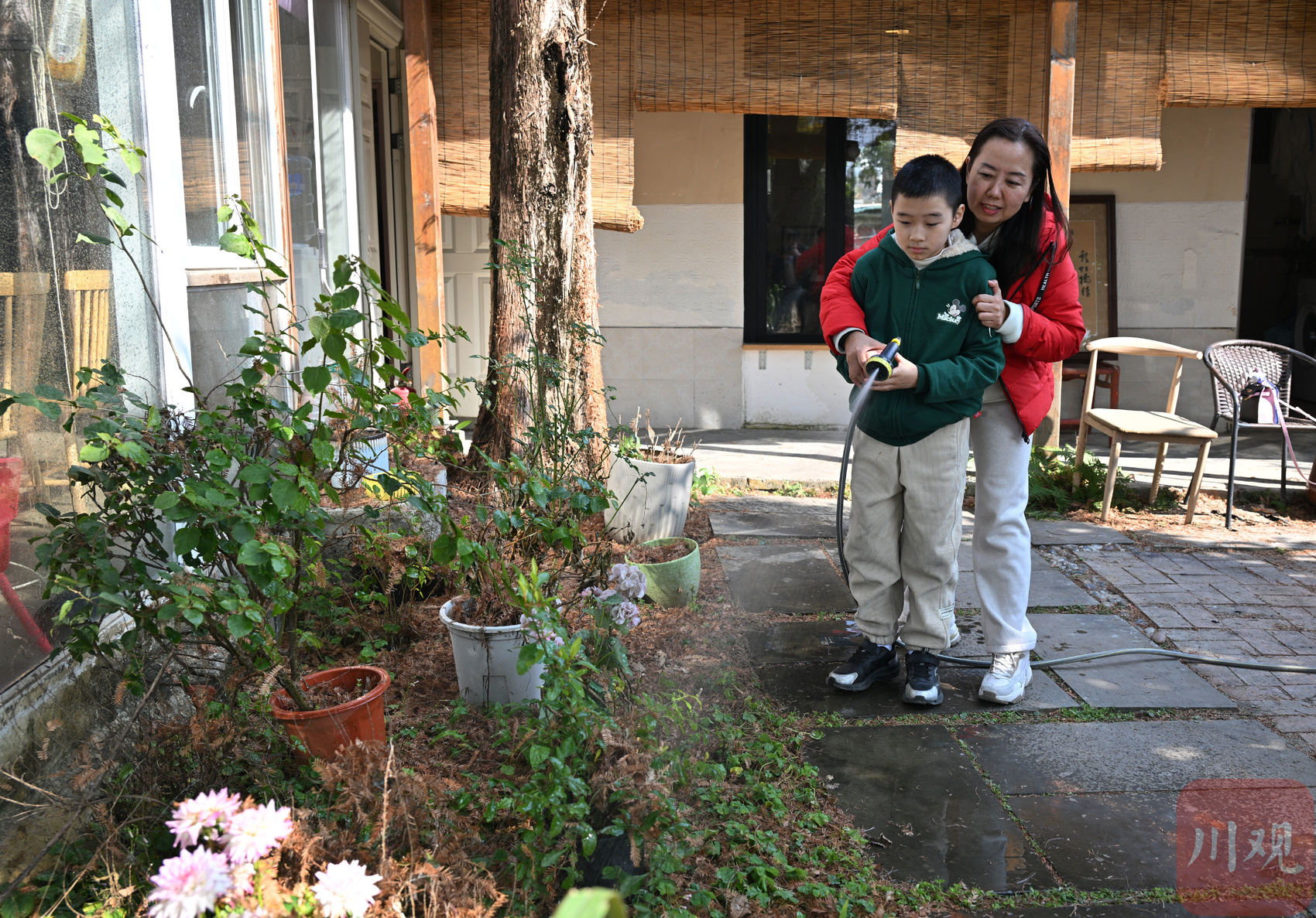 陈文静领着一名自闭症孩子给花草树木浇水。