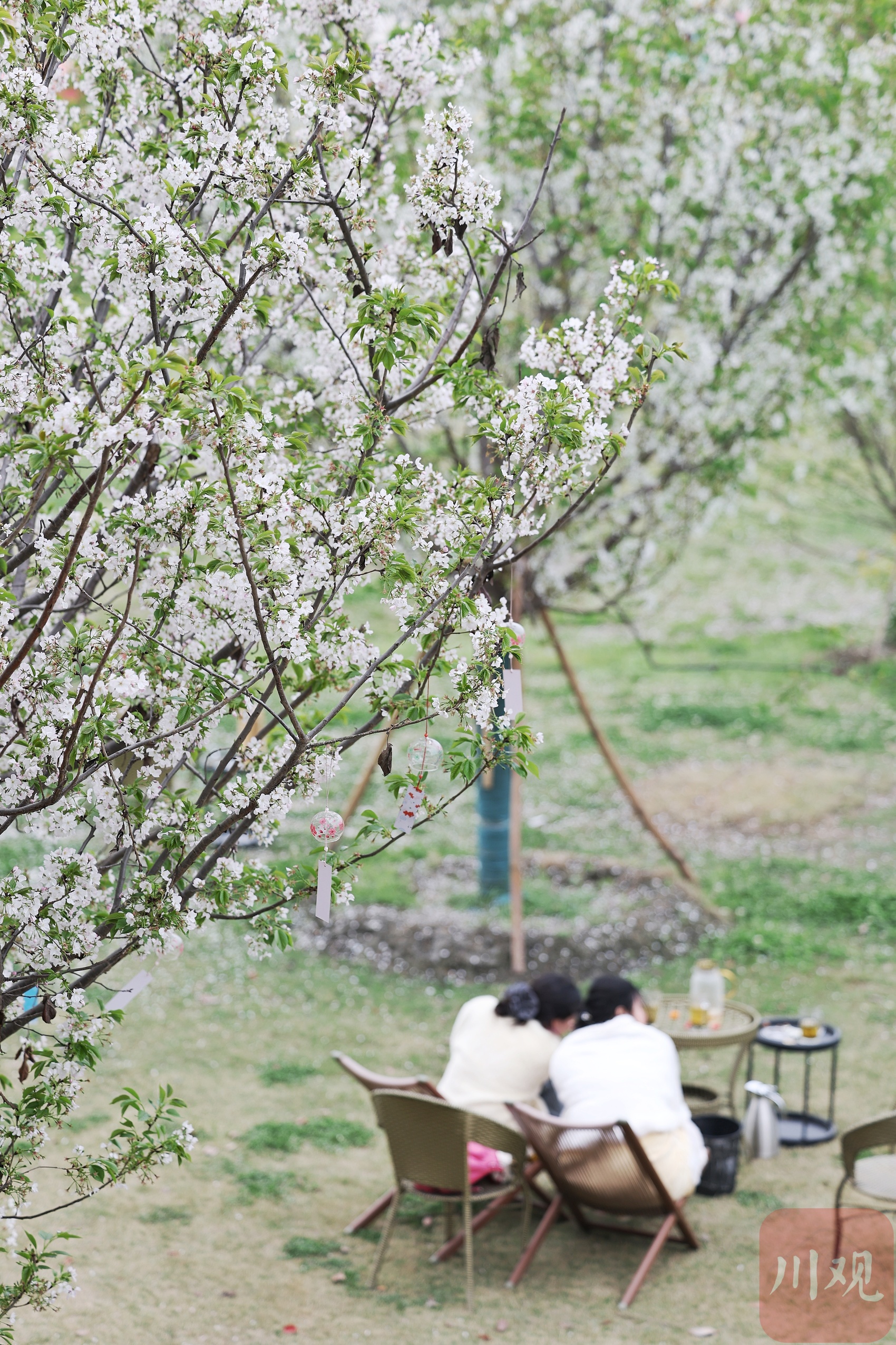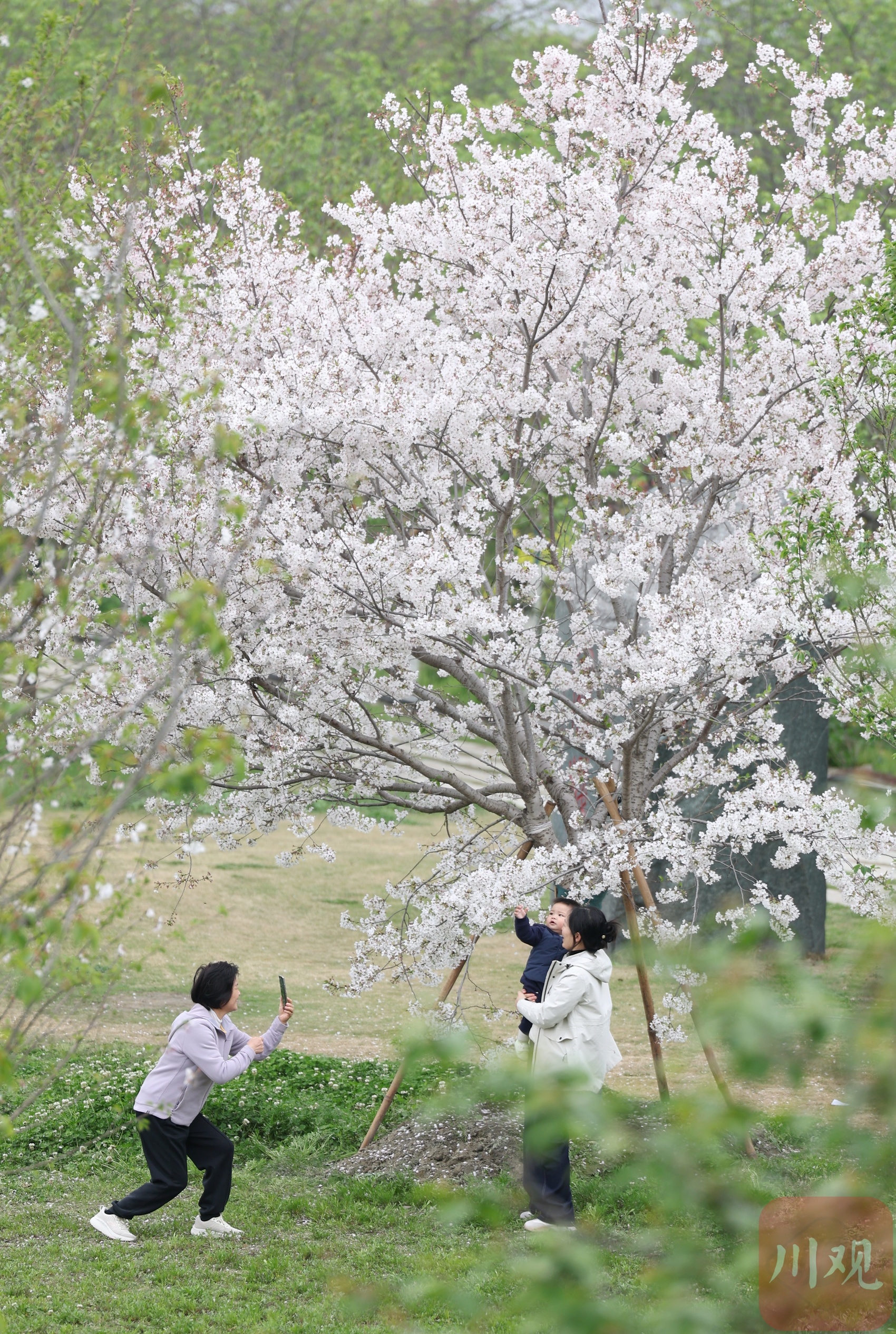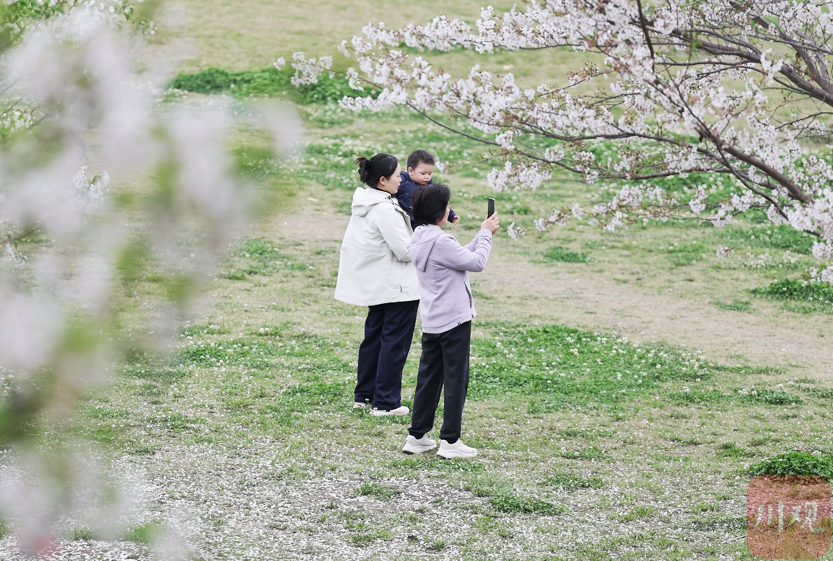 3月15日,成都市新都区斑竹园绛樱园内,300亩樱花虽近花期尾声,枝头残留的粉白花瓣,依旧吸引着市民抢抓最后时机游园赏景。