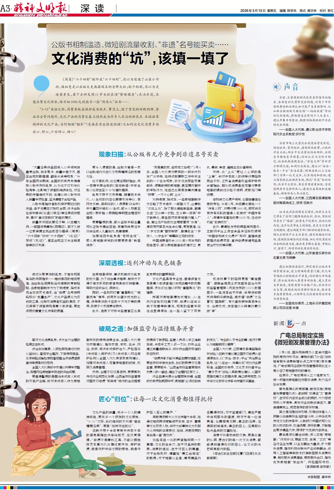 透过纷繁复杂的乱象,不难发现其背后的共同推手——唯利是图的短视思维。当出版社把再版当成简单的复制粘贴,当微短剧制作方为了拼速度、降成本完全放弃艺术追求,当“非遗”名号被明码标价“批量生产”,文化产品便沦为逐利的工具。这种对消费者权益的漠视,不仅误导了读者特别是青少年读者,更在深层伤害着文化传承的根基。