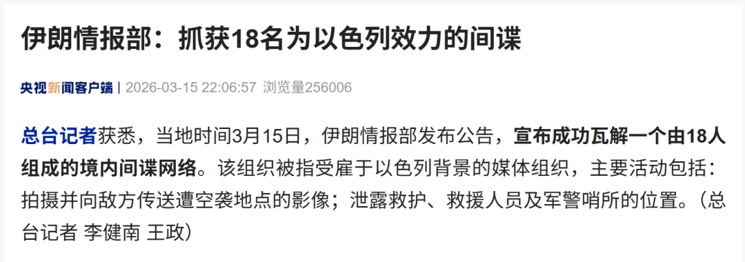 总台记者获悉,当地时间3月15日,伊朗情报部发布公告,宣布成功瓦解一个由18人组成的境内间谍网络。该组织被指受雇于以色列背景的媒体组织,主要活动包括:拍摄并向敌方传送遭空袭地点的影像;泄露救护、救援人员及军警哨所的位置。