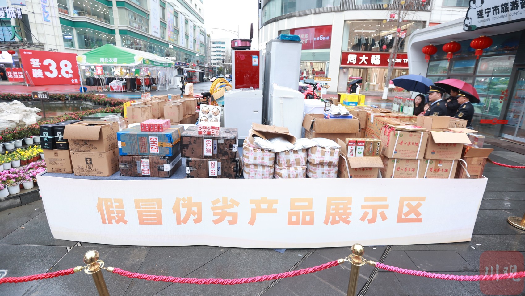 “这个包装手感粗糙,防伪标签模糊,和正品有明显区别。”在假冒伪劣商品展示台前,遂宁市市场监督管理局执法人员手持真伪样品,向市民讲解真伪辨别技巧。同时,现场还展示了查获的假冒伪劣食品、药品、烟草、电器等商品,吸引往来群众围观学习。