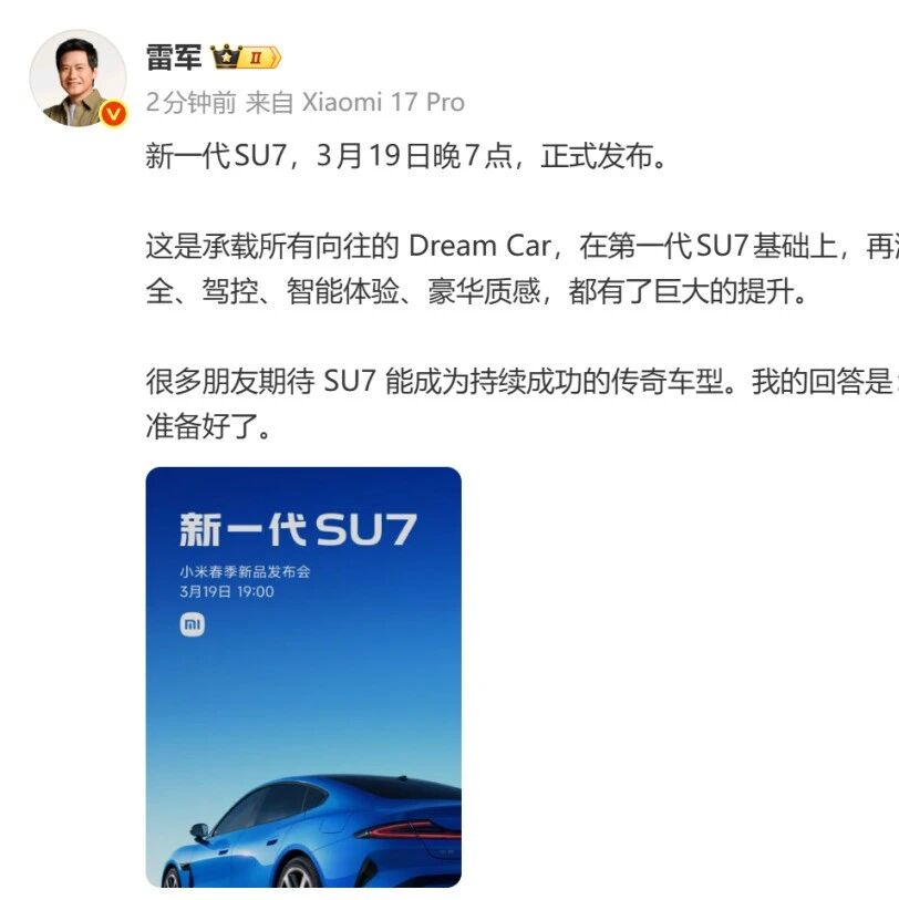 3月16日,雷军发文:新一代SU7,3月19日晚7点,正式发布。