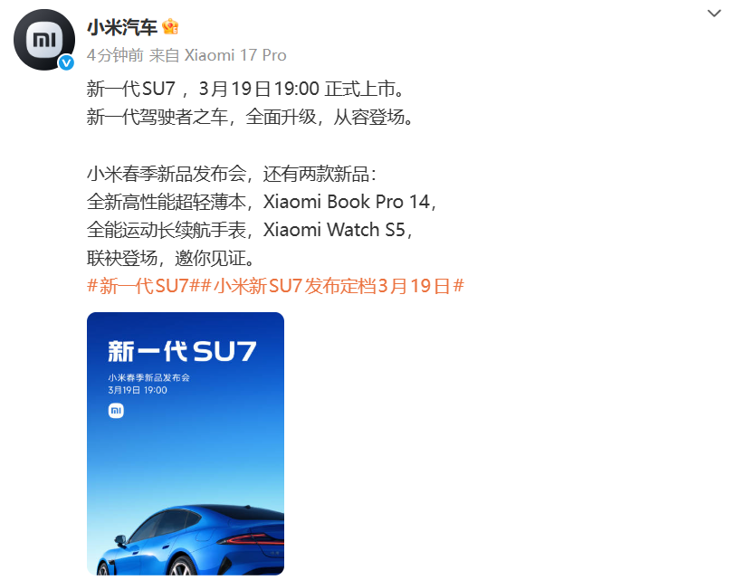 同日,@小米汽车 发文官宣新一代SU7 ,3月19日19:00 正式上市。