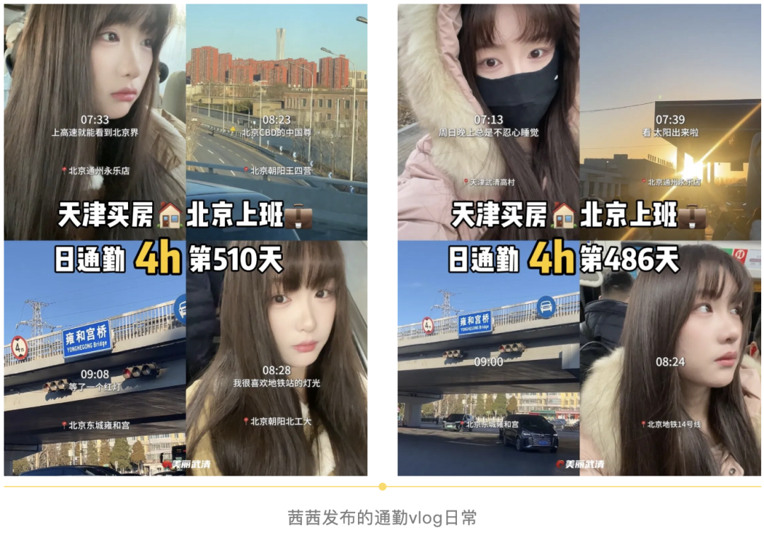 清晨六点半,天津武清高村镇,茜茜挎着相机走出家门,一边吃着煎饼果子一边前往班车点。她要搭乘那趟熟悉的定制快巴,开启一天往返京津的跨城通勤。镜头里的她始终元气满满:车上化个妆,剪剪视频,偶尔还能补个美容觉。从武清到北京二环,全程1小时40分钟,通勤效率甚至比她此前居住在北京时还要高。