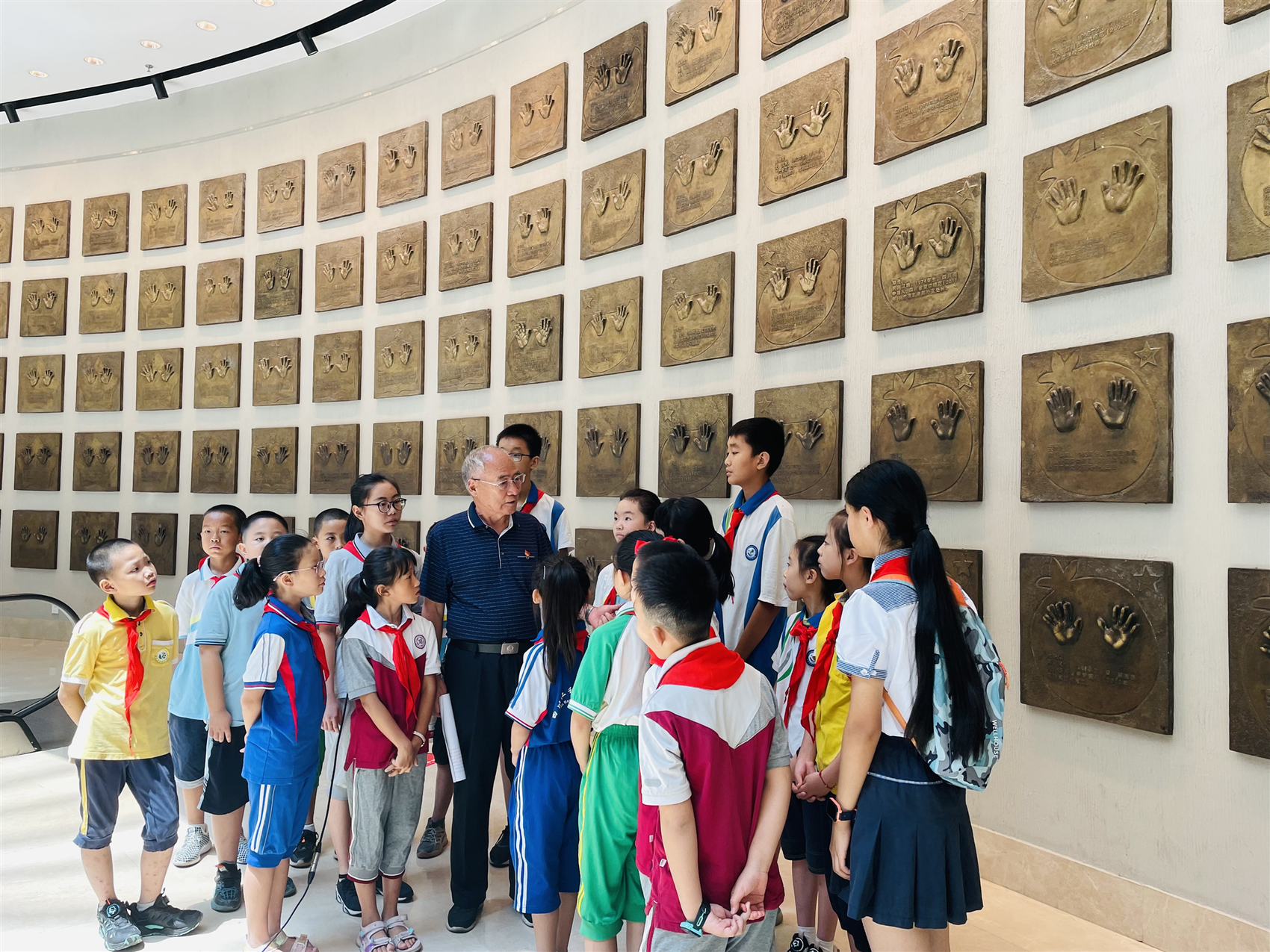 “三线五老”张彦博在攀枝花中国三线建设博物馆百名劳模手印墙前为青少年宣讲劳模故事