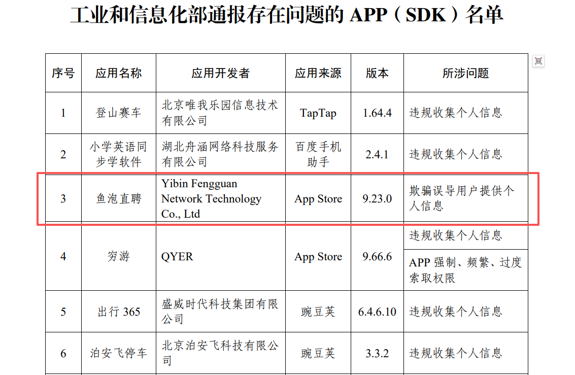 在“3·15”国际消费者权益日前夕,移动应用合规问题再次成为监管焦点。近日,工业和信息化部发布《关于侵害用户权益行为的APP(SDK)通报》,其中,蓝领招聘平台“鱼泡直聘”9.23.0版本因“欺骗误导用户提供个人信息”被点名。