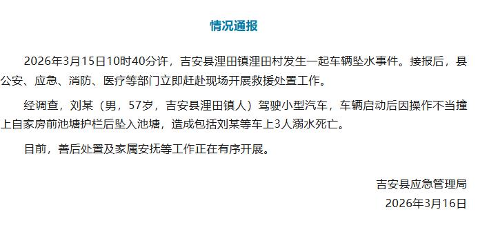 经调查,刘某(男,57岁,吉安县浬田镇人)驾驶小型汽车,车辆启动后因操作不当撞上自家房前池塘护栏后坠入池塘,造成包括刘某等车上3人溺水死亡。
