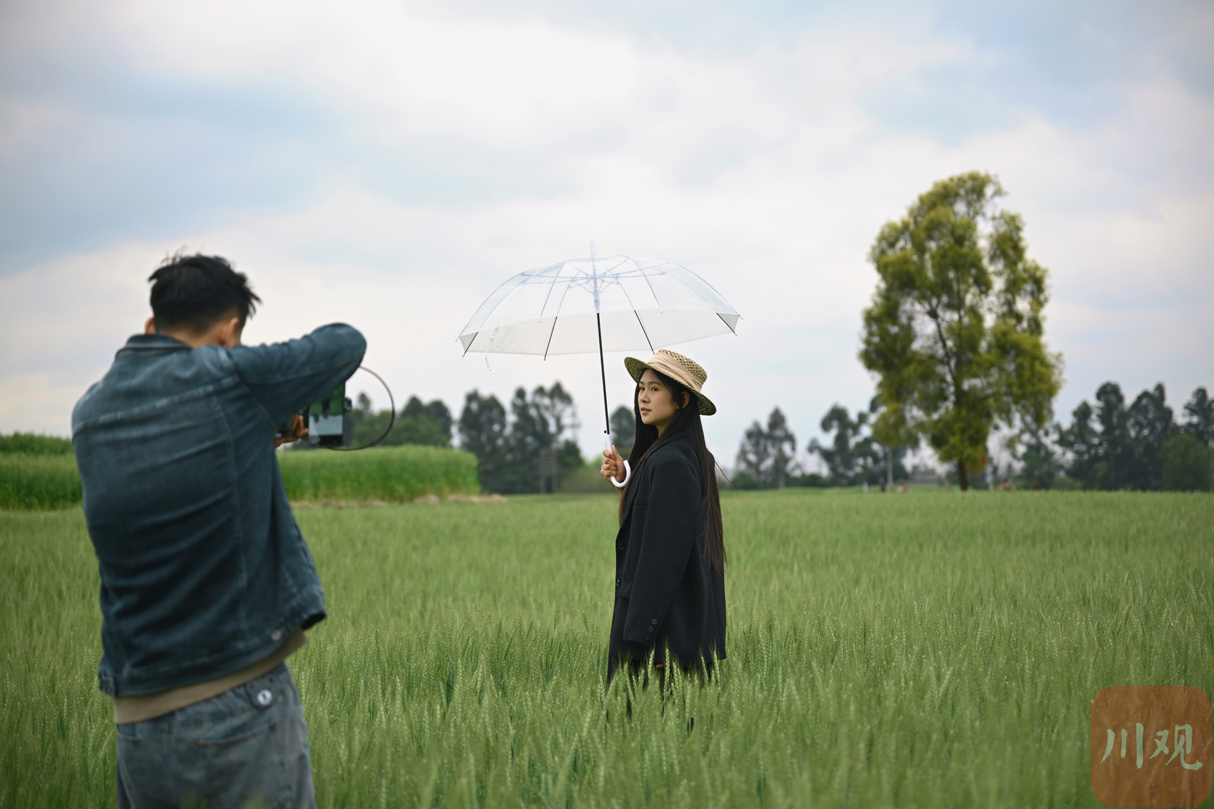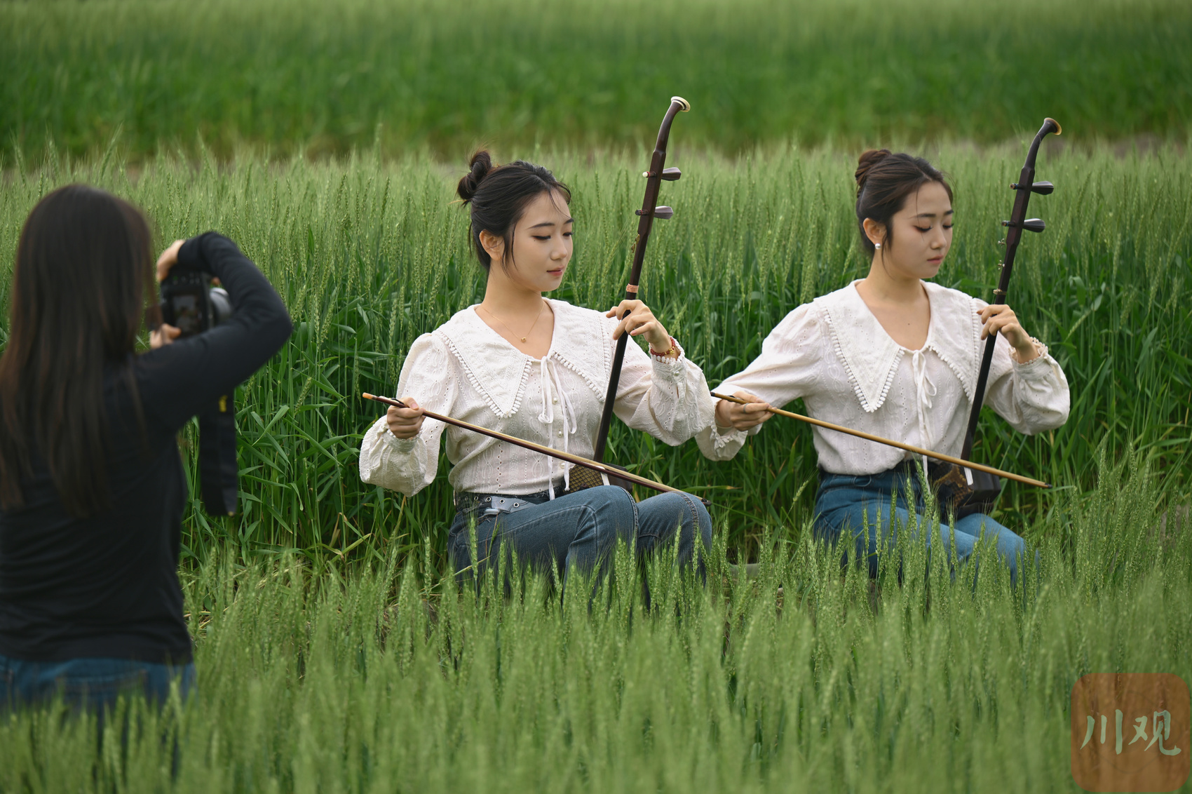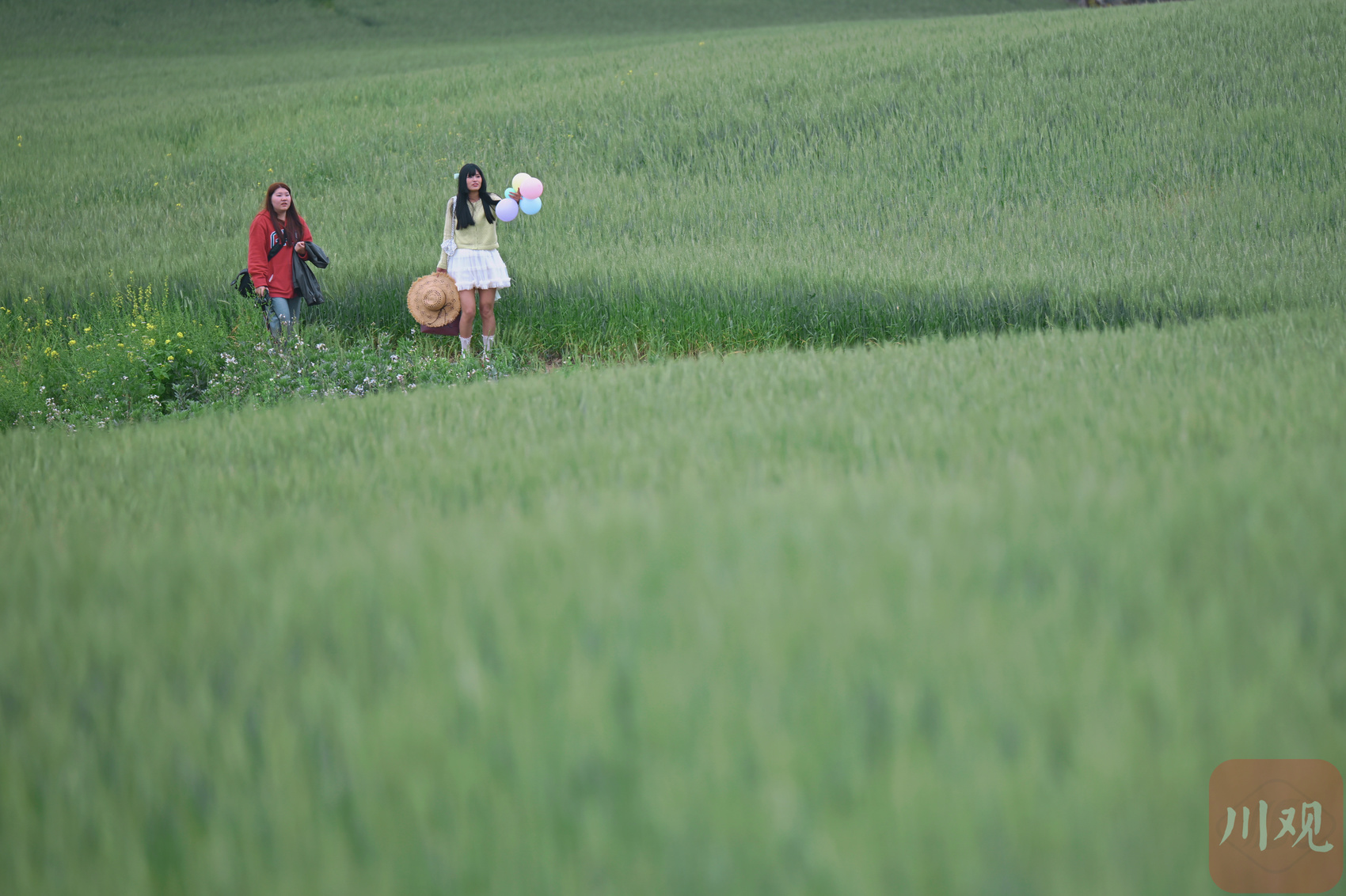 市民在绿色麦田里拍照