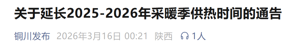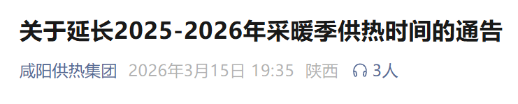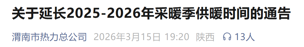 根据气象部门预报,3月16日至17日我市将出现降水、降温天气过程,18日起气温逐步回升。为切实保障群众采暖需求,经市政府同意,原定于2026年3月15日24时结束的集中供热,延长至3月17日24时。延长供热期间,不再向用户另行收取费用。