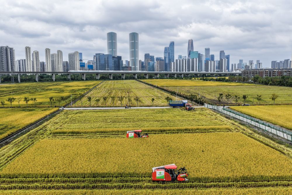 2025年10月21日,在浙江杭州萧山区,收割机在稻田里收割水稻,远处高铁列车飞驰而过(无人机照片)。新华社记者 徐昱 摄