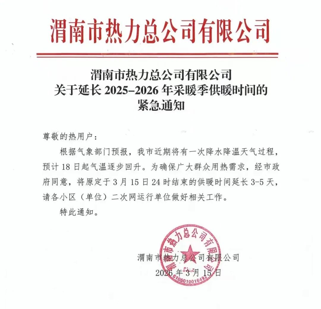 根据气象部门预报,3月16日至17日我市将出现降水、降温天气过程,18日起气温逐步回升。为切实保障群众采暖需求,经市政府同意,原定于2026年3月15日24时结束的集中供热,延长至3月17日24时。延长供热期间,不再向用户另行收取费用。