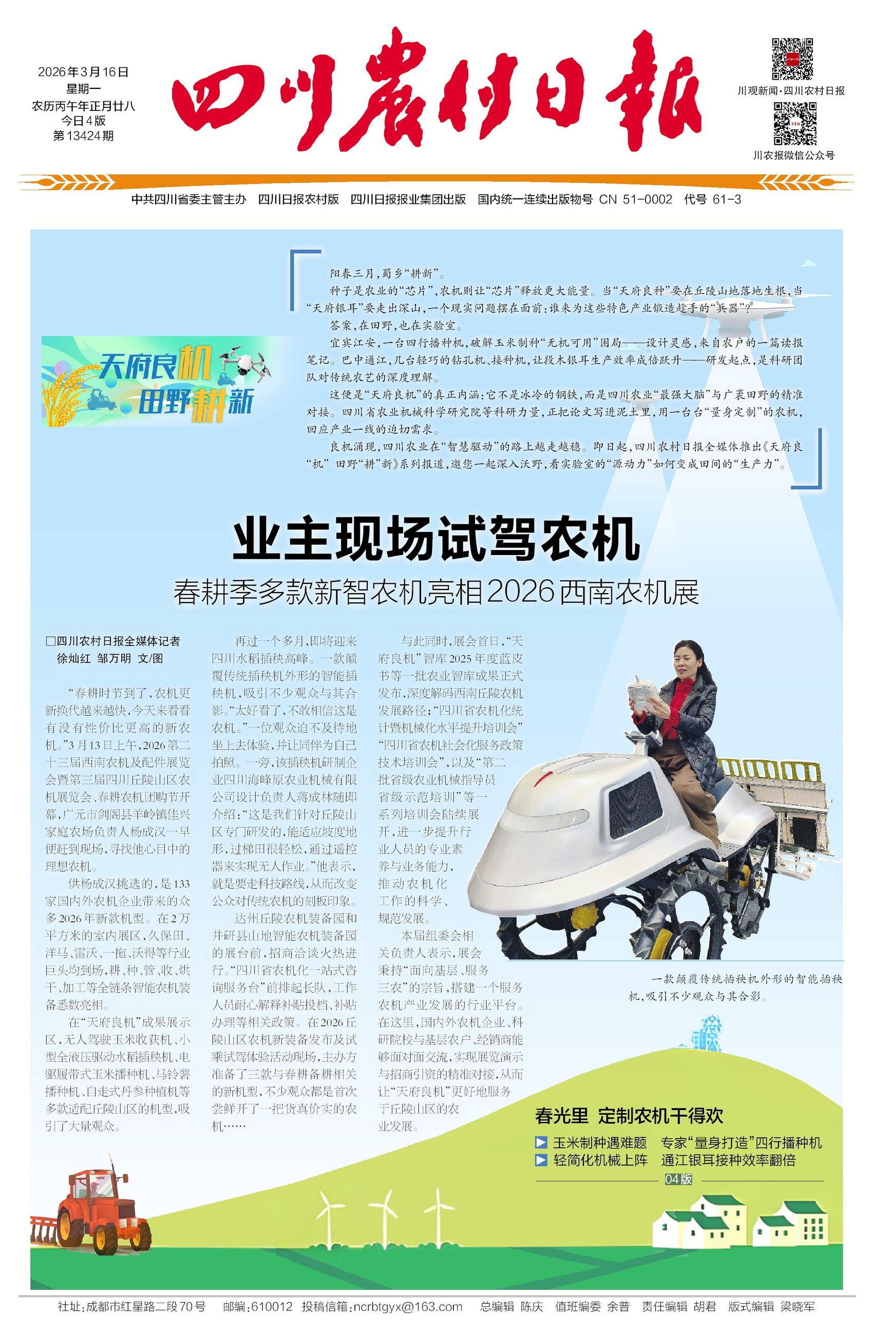 在2026第二十三届西南农机及配件展览会暨第三届四川丘陵山区农机展览会上,多款适配四川丘陵山区的新智农机集中亮相,业主现场试驾体验 “定制农机”。从颠覆传统的智能插秧机,到无人驾驶玉米收获机,四川正用 “天府良机” 把实验室里的 “源动力” 变成田间的 “生产力”,为丘陵山区农业现代化装上 “四川智能芯”。