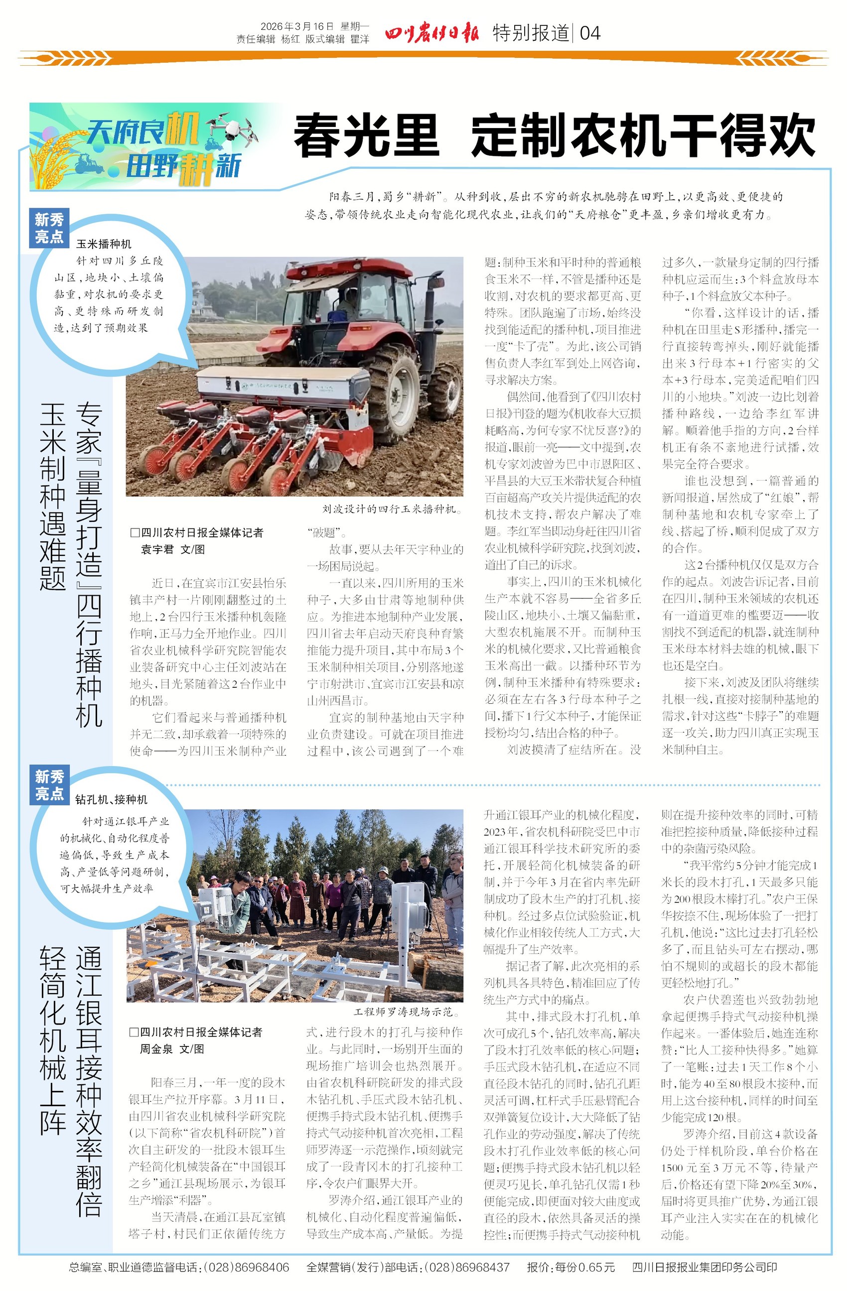 阳春三月,蜀乡“耕新”。种子是农业的“芯片”,农机则让“芯片”释放更大能量。当“天府良种”要在丘陵山地落地生根,当“天府银耳”要走出深山,一个现实问题摆在面前:谁来为这些特色产业锻造趁手的“兵器”?