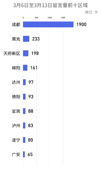 各市州及天府新区的留言量分别为:成都1900件、南充233件、天府新区198件、绵阳161件、达州97件、德阳93件、宜宾88件、泸州83件、遂宁80件、广安65件、自贡56件、内江52件、眉山49件、乐山46件、凉山44件、巴中43件、广元41件、攀枝花35件、资阳29件、阿坝19件、甘孜17件、雅安9件。