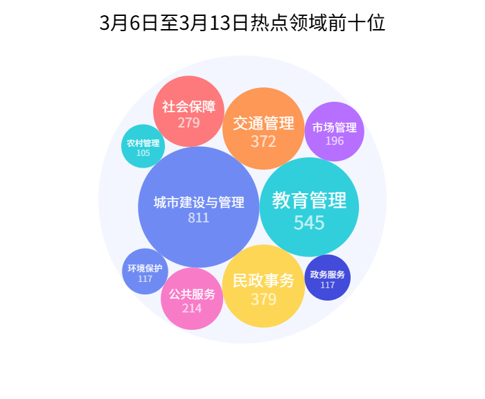 网民留言领域前十分别为城市建设与管理811件、教育管理545件、民政事务379件、交通管理372件、社会保障279件、公共服务214件、市场管理196件、政务服务117件、环境保护117件、农村管理105件。