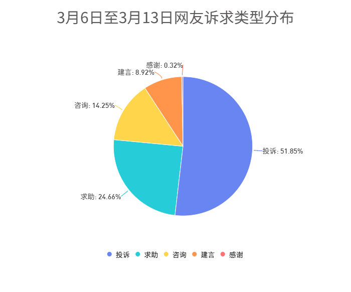 留言类型中投诉类最多,共1918件,占比51.85%;第二为求助类912件,占比24.66%;第三为咨询类527件,占比14.25%。此外,建言类330件,感谢类12件。