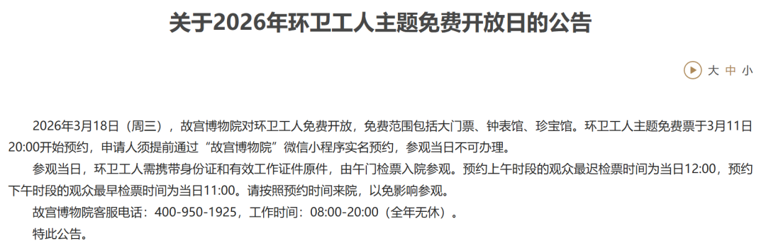 故宫博物院:3月18日(周三),故宫博物院对环卫工人免费开放,免费范围包括大门票、钟表馆、珍宝馆。