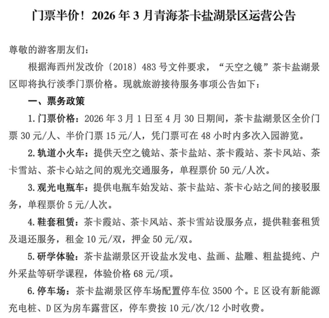 茶卡盐湖景区:3月1日至4月30日期间,景区全价门票30元/人、半价门票15元/人,凭门票可在48小时内多次入园游览。