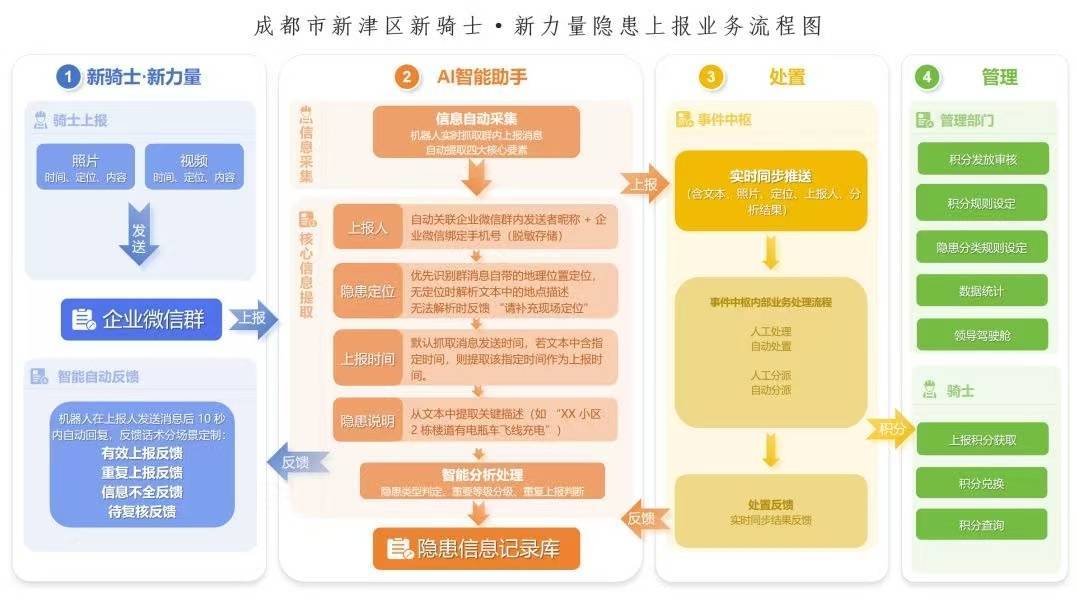 骑手上传后,群内的“AI小助手”便立马接手后续工作——自动抓取上报人、隐患位置、发生时间、问题详情等关键信息,同步推送至新津区事件中枢平台,再由城运中心精准派单到对应部门和街道、社区,快速核查、快速处置、快速反馈。从“一键上报”到“智能分析”,从“部门快处”到“奖励兑现”,全程可追踪、可查看、可监督,真正做到小事不出社区、大事快速联动、隐患不过夜。