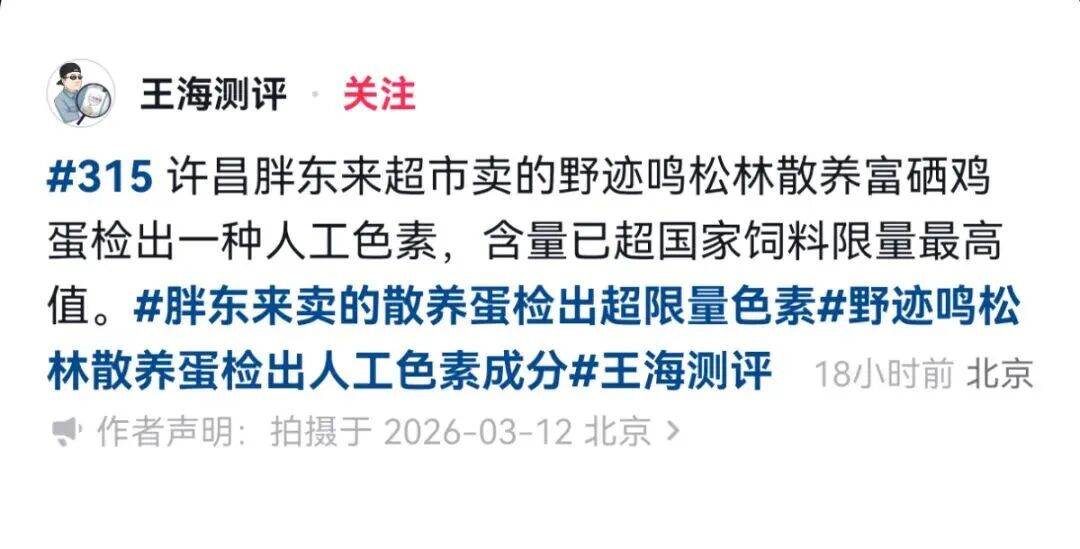 3月13日,博主“王海测评”发视频称,许昌胖东来超市的鸡蛋检测出一种名为角黄素(斑蝥黄)的人工色素,含量为9.54mg/kg,超出农业农村部发布的《饲料添加剂安全使用规范》蛋禽类饲料中斑蝥黄允许的最大添加量8mg/kg,存在一定的食用安全隐患。