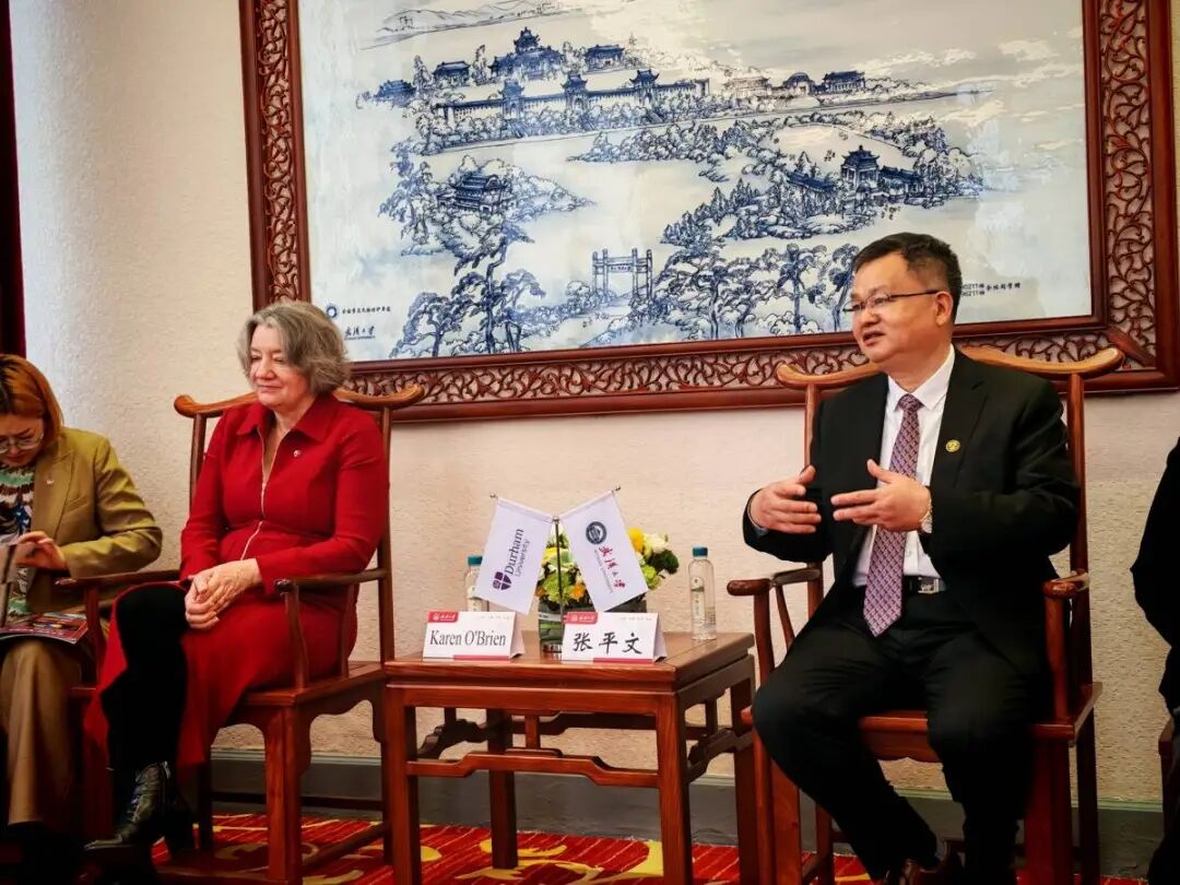 武汉大学校长张平文和杜伦大学校长凯伦·奥布莱恩接受采访