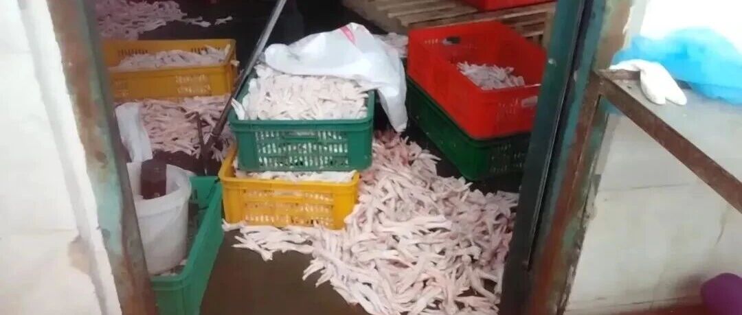 在鸡爪产品前期加工现场,记者看到食品加工车间里,泡制区、修剪区、挑选区臭气弥漫,刺鼻的腥臭味让人作呕,生产环境脏乱不堪:地面长期淤积着浑浊污水,各类塑料筐杂乱无章随意堆放,生产机械设备表面污渍厚重、油污遍布。在这个车间里,大量鸡爪直接裸露堆放在潮湿肮脏的地面上,扫帚、铁锹等清洁工具随意压放在鸡爪之上;即便鸡爪被人员踩踏,工人也只是随手捡起,直接放回加工筐中继续使用,完全无视食品卫生安全。