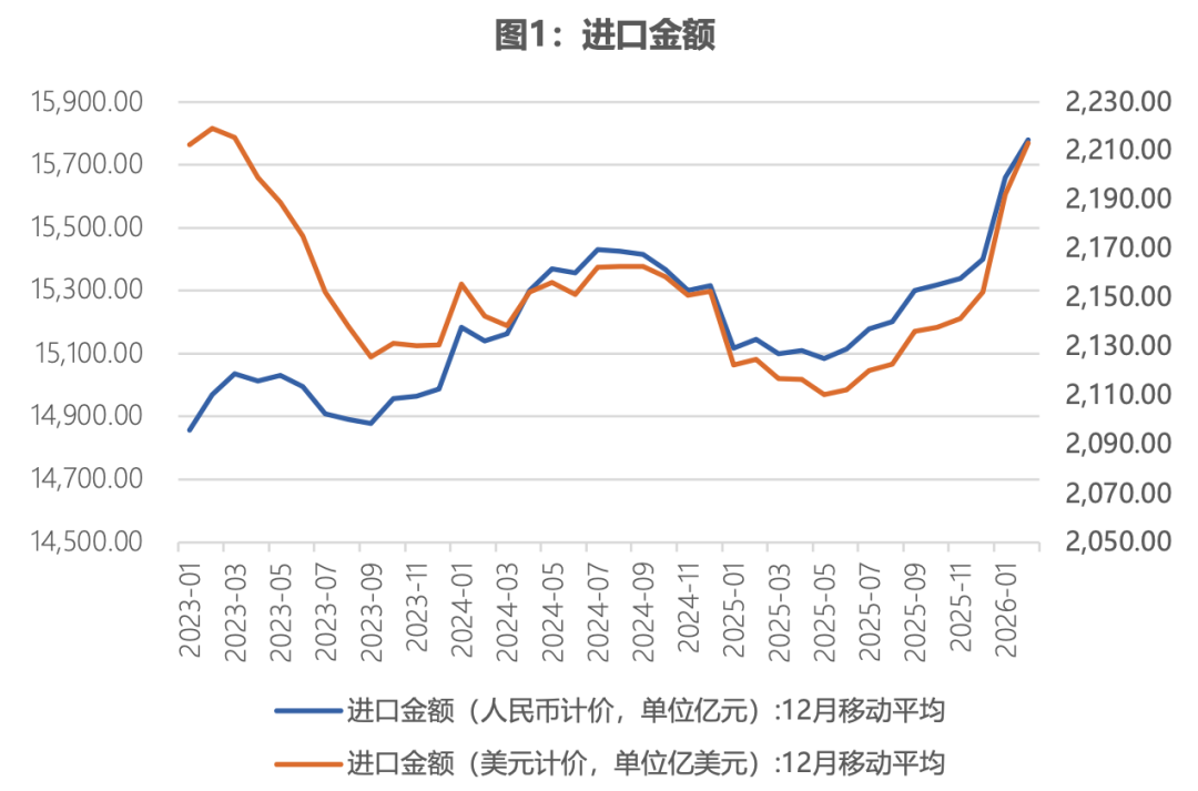 3月16日,国家统计局发布了2026年1-2月的主要宏观指标。1-2月全国规模以上工业增加值同比增长6.3%,比去年12月份加快1.1个百分点。内需方面,1-2月社会消费品零售总额同比增长2.8%,增速较去年12月回升1.9个百分点;固定资产投资同比增长1.8%,上年全年为下降3.8%。此外,1-2月我国美元计价的进口金额同比增长19.8%,去年12月增速为5.7%。通胀方面,2月份,我国CPI同比上涨1.3%,环比上涨1%,分别录得近三年和近两年的最高值,其中核心CPI同比上涨1.8%,涨幅比上月扩大0.5个百分点。2月工业生产者出厂价格指数(PPI)同比下降0.9%,降幅比上月收窄0.5个百分点,连续3个月降幅收窄。针对上述宏观数据,我们有以下三点评论。第一,内需的改善进一步显现,验证了我们之前对宏观经济复苏的判断。1-2月经济数据基本验证了我们此前的判断,即周期的底部或许已经过去。(详见CF40研究·简报《》)。具体而言,我们此前判断,2025年投资的实际动能并不弱,2026年年初固定资产投资增速读数的转正也并不意外。如前所述,这与我们对周期拐点的判断一致,伴随着供给侧收缩的结束,投资逐渐进入上行周期。基建投资的快速修复表明宏观政策积极发力,财政支出有望保持力度,有利于稳定市场预期。另一个值得关注的现象是前两个月我国进口金额同比的高增。事实上,如果观察进口金额的绝对值变化,自2025年6月起,我国进口金额就已经止跌回升,这一过程与我们观察到的其他宏观数据表现是一致的。因此,如果进口的增长是可持续的,这意味着需求侧的实际修复速度要好于市场预期。